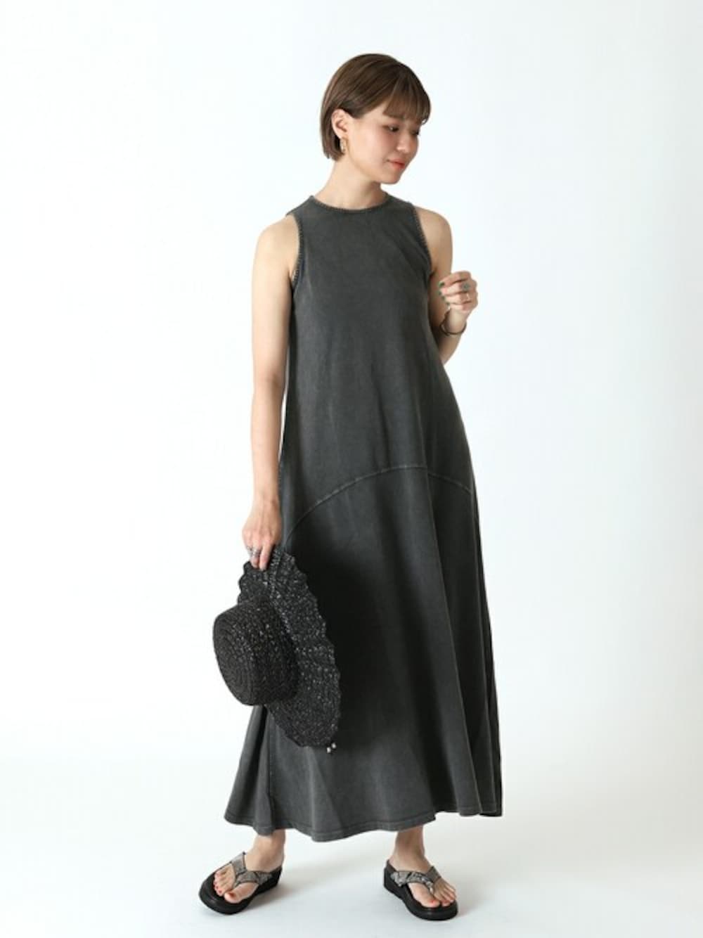今一番お気に入りのワンピース♡ デニムとのレイヤードスタイルもオススメですが、今回は一枚で着てみました♪ アメリカンスリーブが好きでトップスは何枚かもっていますがワンピースは珍しい♡ 二の腕を出しすぎない露出感で、デザイナーの苦労が見える絶妙なアームの空き具合です◎ 子供の抱っこで鍛えられたたくましい肩周りをスッキリと演出してくれる優秀ワンピース、オススメです!! 【snowウォッシュアメスリワンピース】 ----- 着心地 ----- ピグメント加工を施すことでぎゅっと目の詰まったしっかり目の風合いに仕上がっていますが、生地の厚みはほど良く、軽やかな生地感です◎アメリカンスリーブですが、肩回りの露出は控えめです◎ほど良い空き具合で一枚でも着やすいデザインでした♪ ----- サイズ感 ----- 肩周りはちょうど良く、アームホールは空きすぎず詰まりすぎずの理想的な大きさでした◎身幅はゆったり目で裾に向かって広がるようなシルエットです。 *** 着用スタッフ情報 *** 身長:165cm 体型:普通 肌:イエローベース秋 骨格:ストレート 普段サイズ:S~M(36~38) 着用サイズ:フリーサイズ