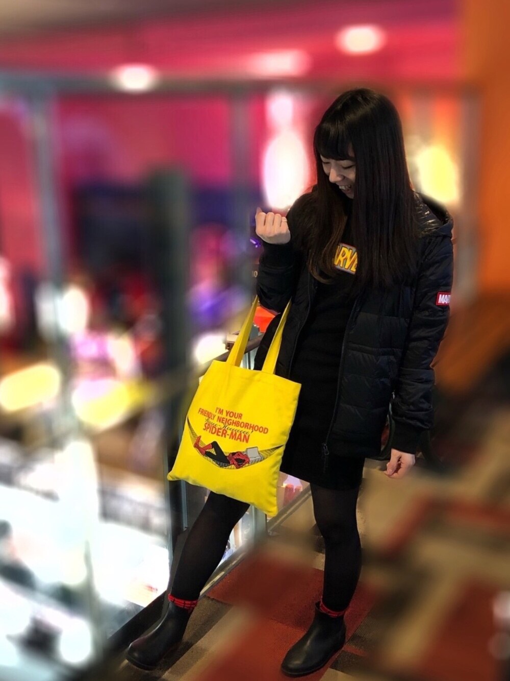 雨の日もスパイダーマンと 一緒にお出かけで気分はルンルン🕷💛❤️ 🕸MARVELファッション🕸 ▶︎ダウンジャケット/TAION ▶︎ワンピース/SLY ▶︎トートバック/MARVEL POP UP STORE ▶︎ソックス/MARVEL POP UP STORE Instagram▶︎@marvelerina◀︎