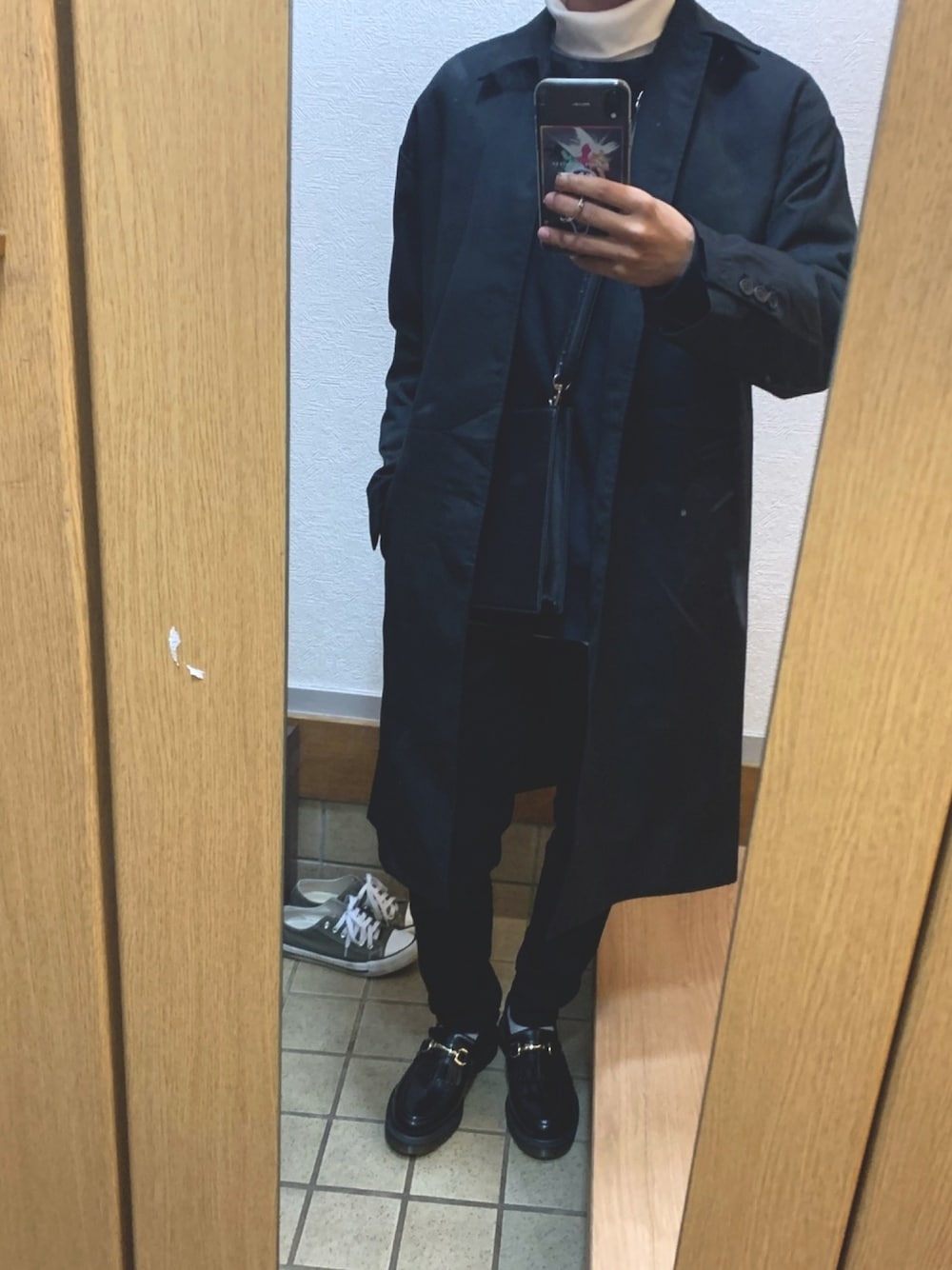 最近買った初おろしステンカラーコート Doopz ステンカラーコート × スキニーパンツ シルエット綺麗めにオーバーサイズ 黒テイストに大人っぽくしてみました🤣 ワンポイントに白のタートルネック Dr.Martensのドレスシューズも量産型のノーマルなデザインではなくちょっと個性あるデザイン 気に入ってます!僕の初コートデビューいいねお願いします!👍