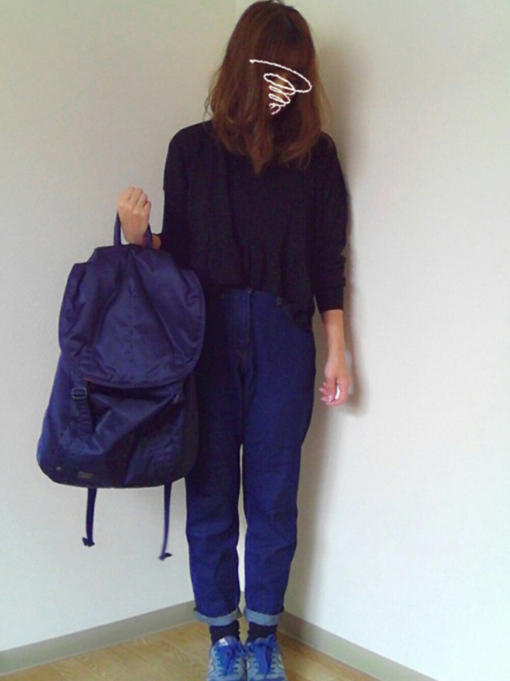 KBFのニットはセールで購入 アシンメトリーになっていてかわいいです リュックはSTUSSYとPORTERのコラボ 旦那さんのを借りました デニムはGU スニーカーはニューバランス ネイビー系のコーデが好きです