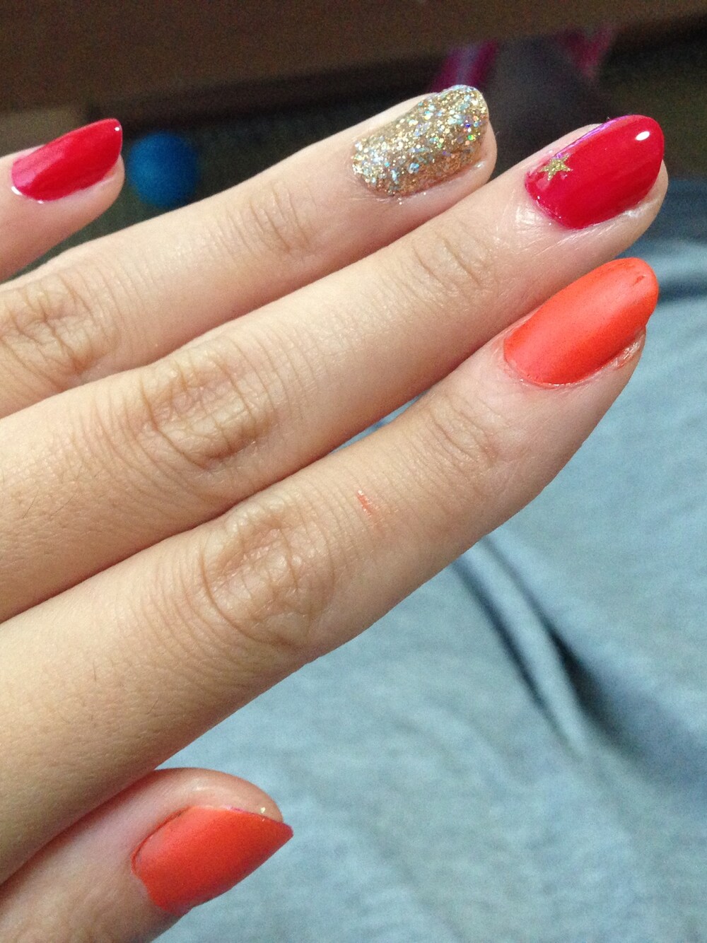 100均のオレンジ 薬局のゴールドと赤 100均マットコート インテグレートのトップコート 配色は拾い物画像を参考に。 鮮赤を使ってテンションあげたかった…