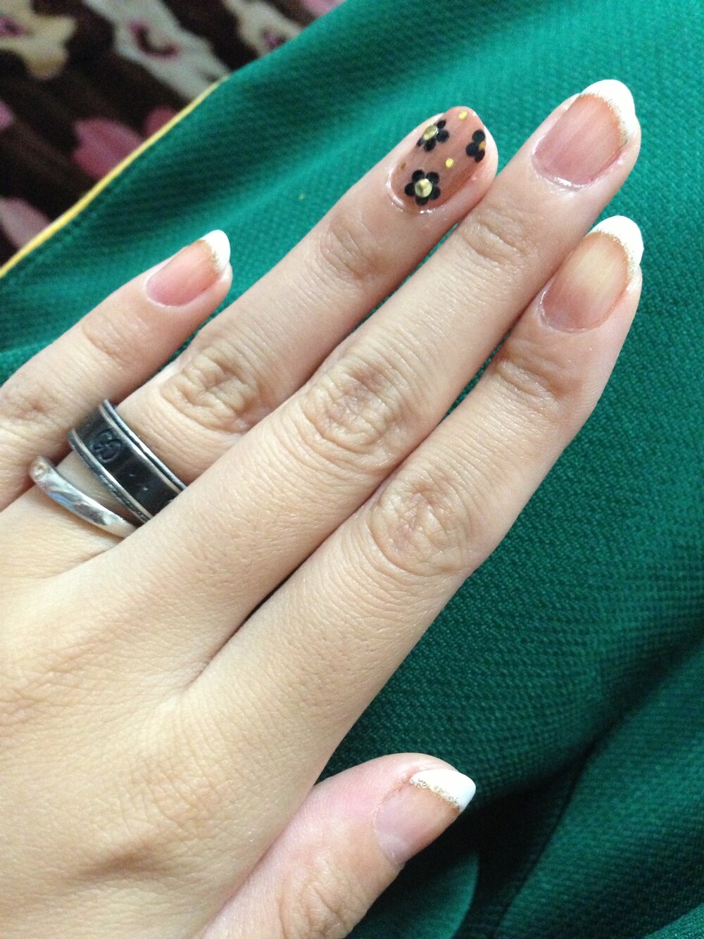 久々にシンプルなフレンチ。 やってみたかったこのお花! 買ったばっかのスタッズ〜♡ 100均で買った白、スタッズ 薬局で買ったベージュ、 雑貨屋のスパンコール? 雑貨屋で買った細筆ゴールド
