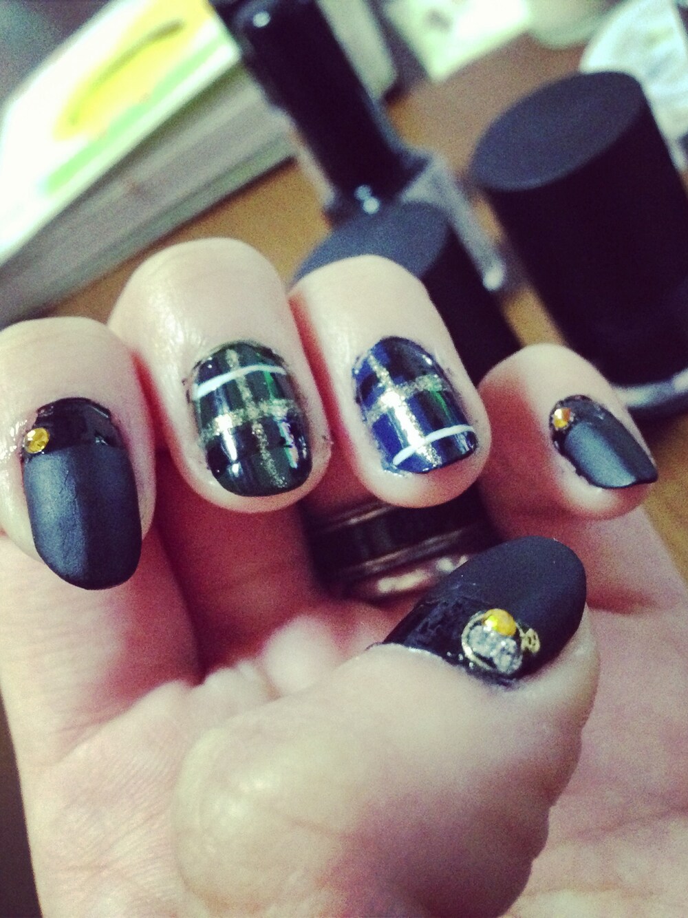 ジェリー付録のマニキュア第三弾 なんか暗ったい色味になったな… チェックも汚いし(¯―¯٥) ジェリー付録のマニキュア青と緑 キャンメイク黒 100均の細白と細金とストーン 雑貨屋のシール