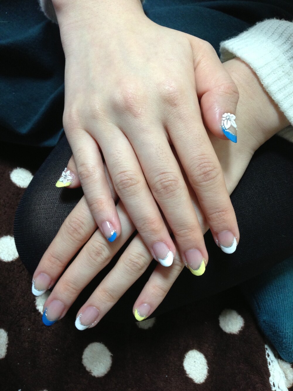 友達のリクエストで、 あるアニメ?ゲーム?の イメージカラーだそうです… ご希望に沿ってフレンチだけど 汚くなったな〜( •́ ⍨ •̀)ゴメン! 100均の白、水色 雑貨屋さんのシール、黄色、細銀