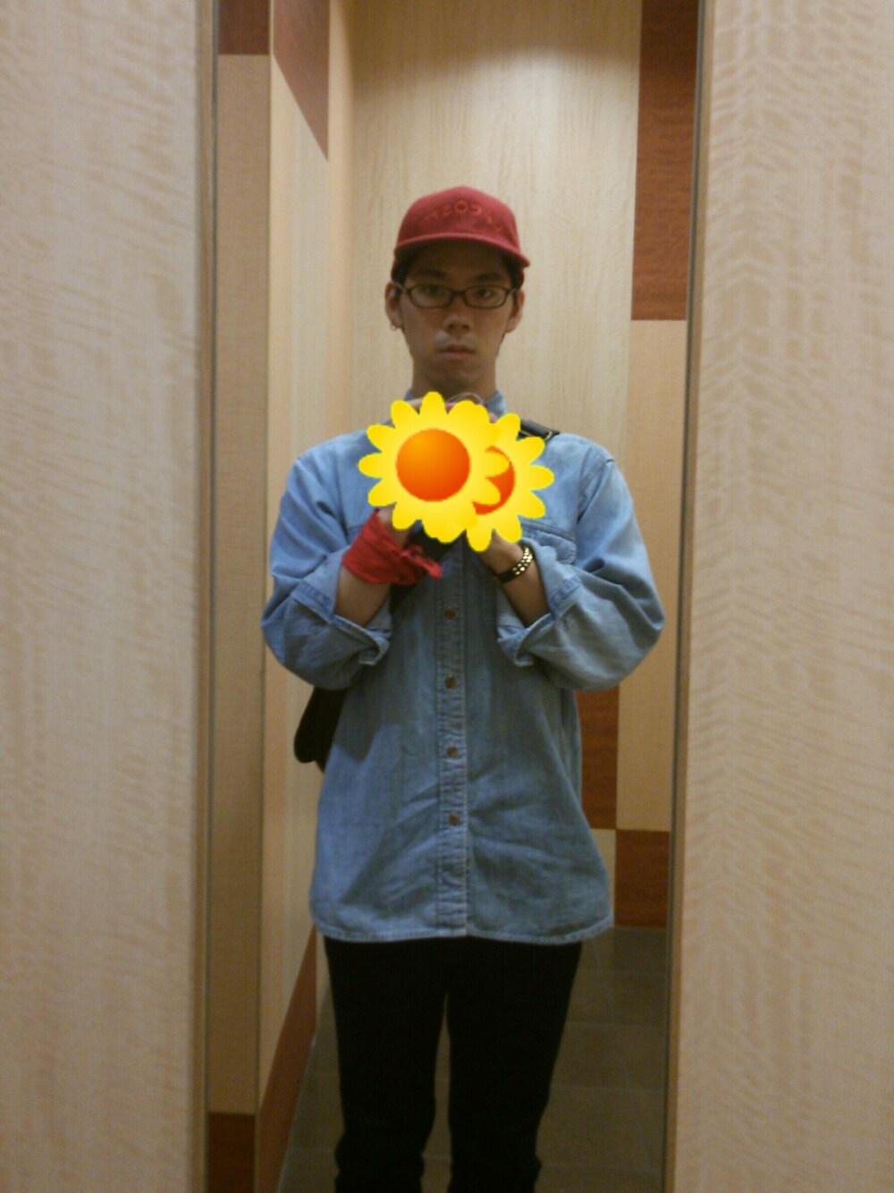 上下デニム地です。帽子、手首に巻いたバンダナ、写真には写ってませんがNIKEのハイカットは全て赤色。 赤色で遊んだコーディネート♪