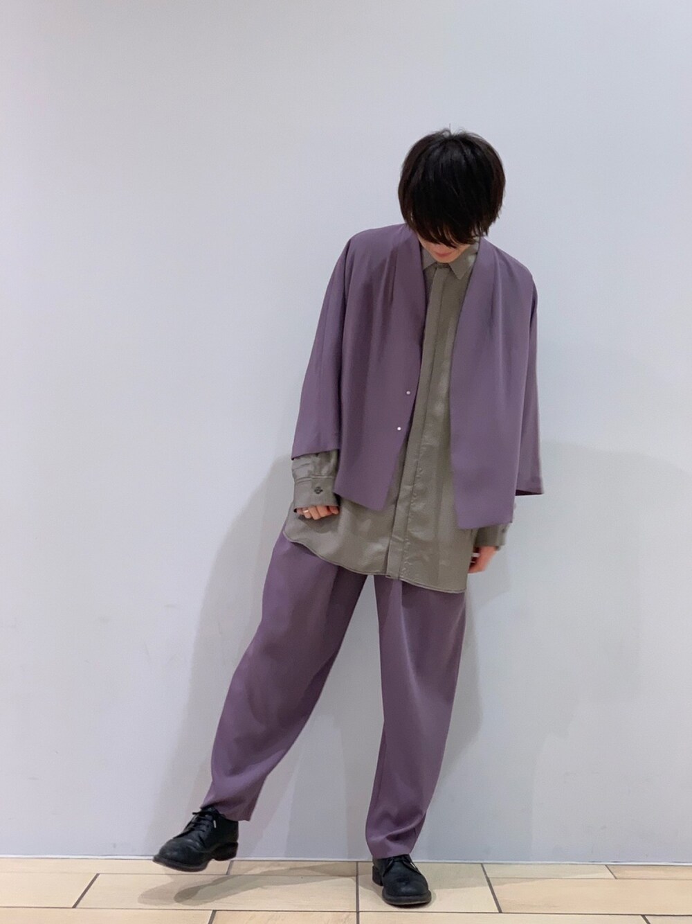 阿部まさひで(Lui's/EX/store TOKYO)のノーカラージャケット「ドルマンジャケット/ビッグシルエット」を使ったコーディネート