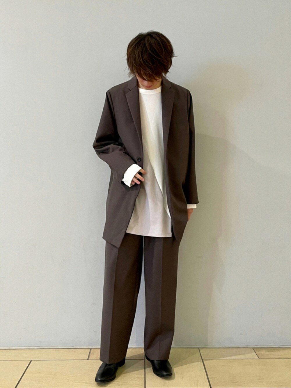 阿部まさひで(Lui's/EX/store TOKYO)のテーラードジャケット「【高密度ウールギャバ 2×2セットアップシリーズ】 スーパービッグジャケット」を使ったコーディネート