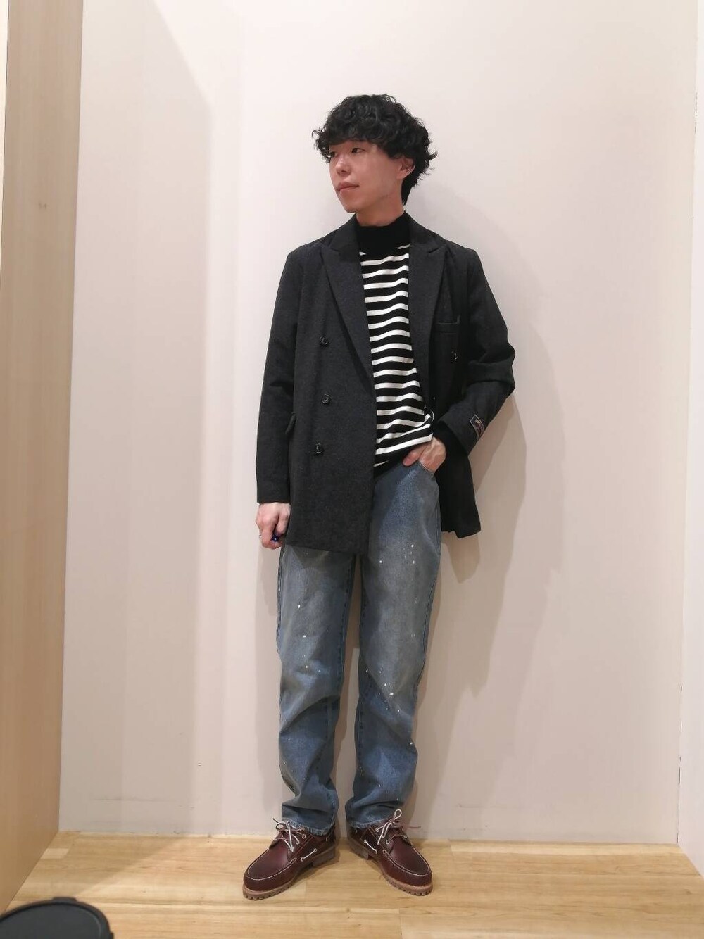 ご覧頂きありがとうございます。 ジャケット、ニット、パンツすべてMサイズを着用しております。 アウターは春といえばの綺麗めなテーラードジャケットになるます。 ニットは柔らかく伸縮性のある生地が着心地の良いユニセックスアイテムになります。 パンツはペイント加工の施された古着ライクなデニムになります。 股上が深く、ハイウエストでの着用になるのでスタイル良く見えます。