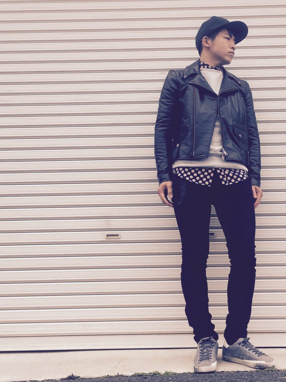 だんだんと暖かくなり、ライダースを着るのにピッタリな季節になってきたのでライダースコーデにしました。 ライダースがブラックなので、インナーはv:roomのライトグレーのスウェットにして軽さを出しました。 ライダースにはドットシャツを合わせてカジュアルになり過ぎないようにしています。 ボトムは、attachmentのブラックパンツにしました。 何にでも合わせられるので困った時はこれですね(笑) GGDBのスニーカーはスウェットに合わせてグレーにしました。 これは、最近購入したスタンスミス型になります。 スタンスミスは被り過ぎるのでこれはあまり被らないかなと思っております。