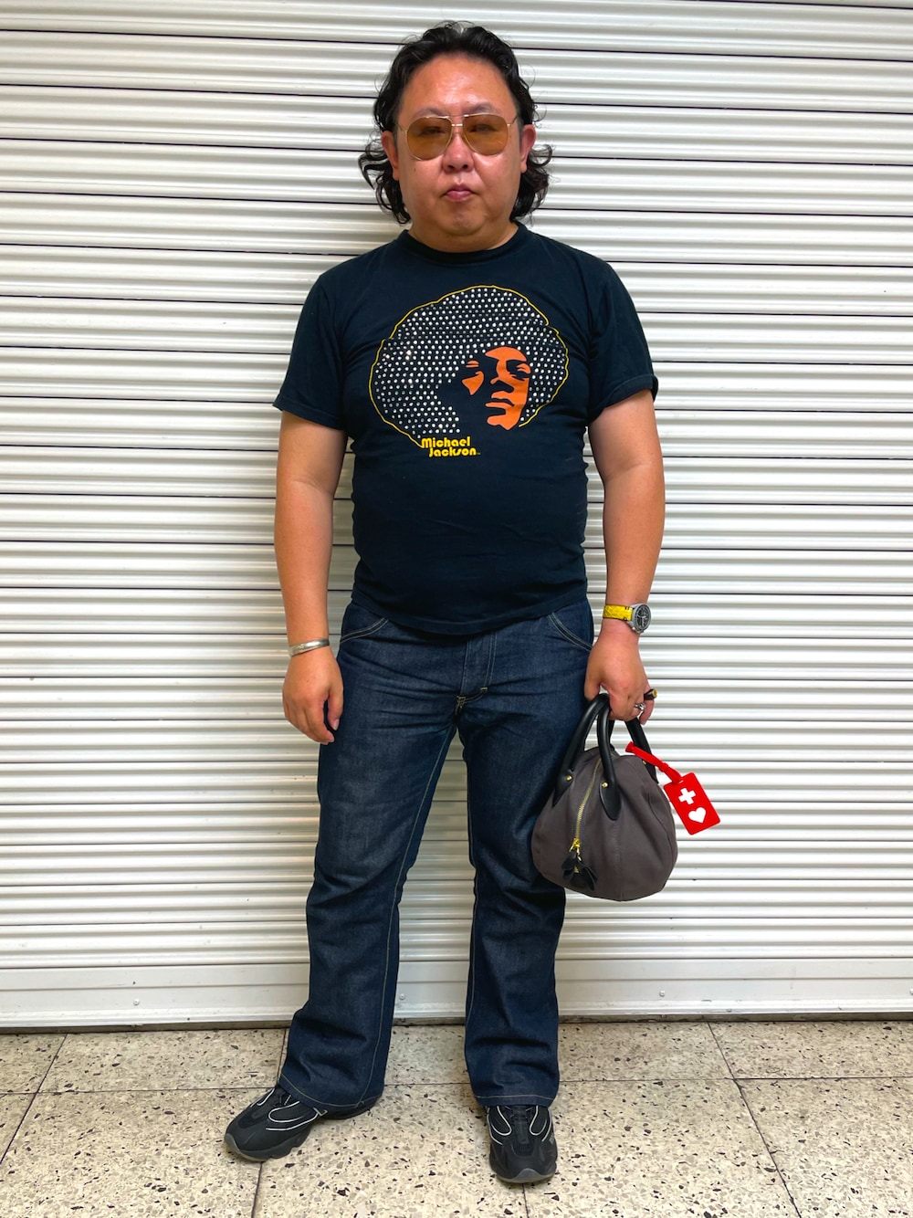 ヴィンテージのマイコーのTシャツ着てキラキラしてめすが、コレSサイズなのでケツ出ちゃうんですよね。 30年以上前の物だから仕方ないか。 足元はnew balanceなのですが、チョイスミスしてます。