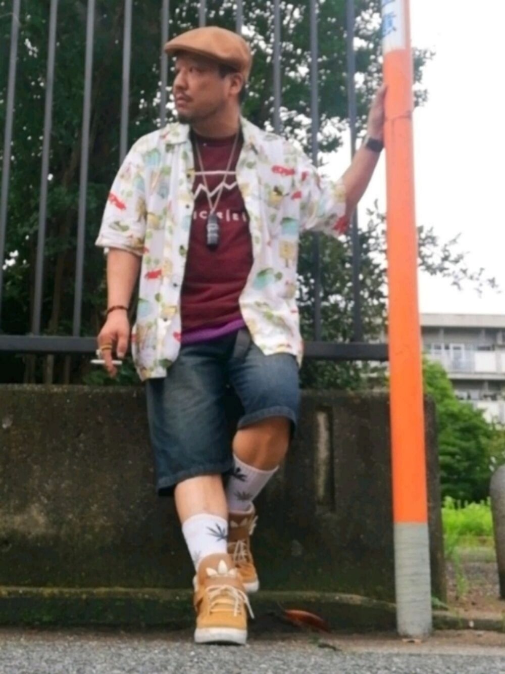 皆さん😊🌴🌵今日は雨上がってムシムシな1日でしたね😅💦今日はアロハシャツの日やから🏝️😎アロハシャツで80年代の雰囲気を、ハンチング帽で、だしつつ(おやじ臭さ😁)コーデしました🏝️ 快晴☀️🏖️なら😅アロハシャツもいい感じになるけど、😅曇りだと暗めになってしまう😅 アロハシャツの柄にソックスもガンジャ柄のソックスにし、柄のまばらさを合わせたのがポイントです😊👆ラインソックスでは、アロハシャツの柄に合わないと思った😅 ネックレスと音楽を聴く🎵イヤホンを引っ付けてTシャツのロゴのブランドのシールを貼って、それっぽくアクセサリーにしました🎧🎵😎👍 今日は😎シック❓ファンキーな😁👍感じな1日でした(笑)😅🏝️