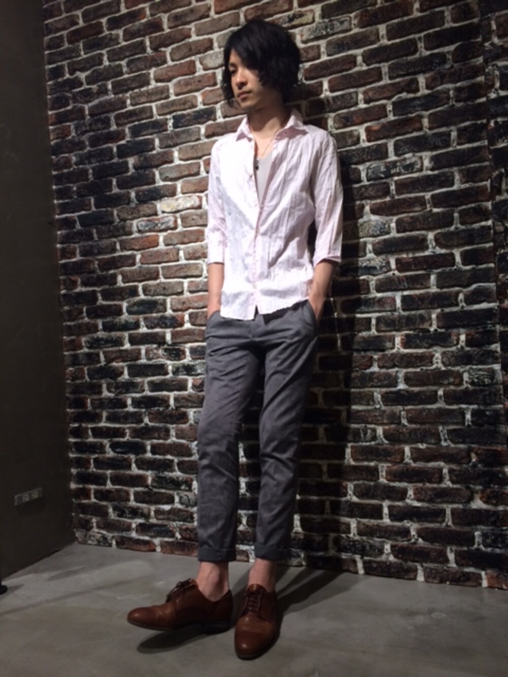 ピンクのシワ加工シャツに総柄のきれいめスラックスを 合わせたスタイリングです。足元はロールアップし、 涼しげな印象に!これからのシーズンに是非、ご参考に して頂きたい組み合わせです!