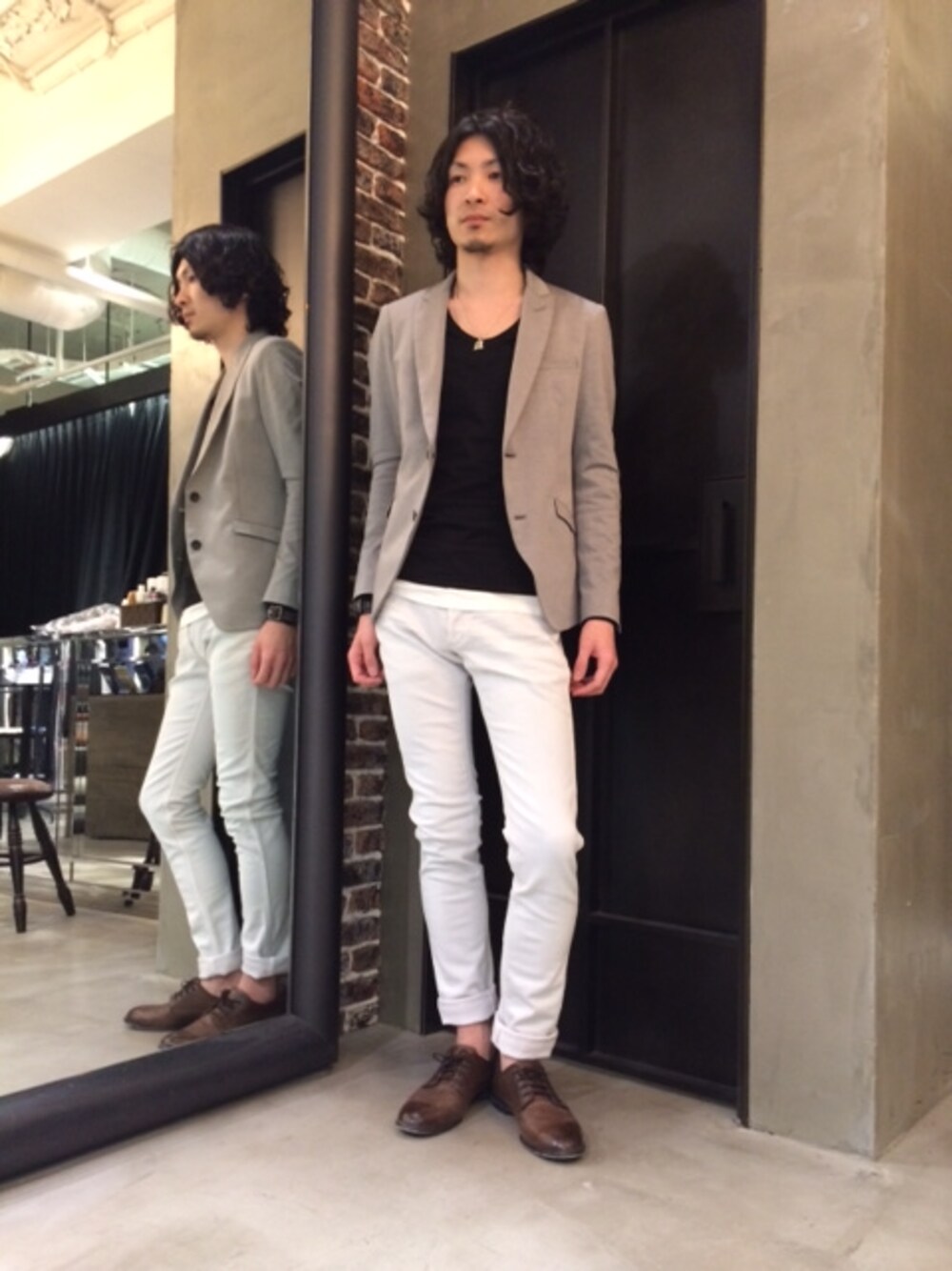 春らしい、明るいカラーでまとめてます。 足元はロールアップで抜け感を出しつつ、ジャケットで きれいめな装いをMIXしたコーディネートになっております。
