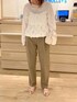 前後着用できるフリンジキャミブラウスをポイントにコーディネート☆ ストレッチ素材で履き心地抜群のパンツは、ウエストの釦でサイズ調節可能! トップスインで着ていただいても可愛いデザインです。(38サイズ着用)