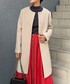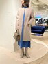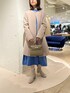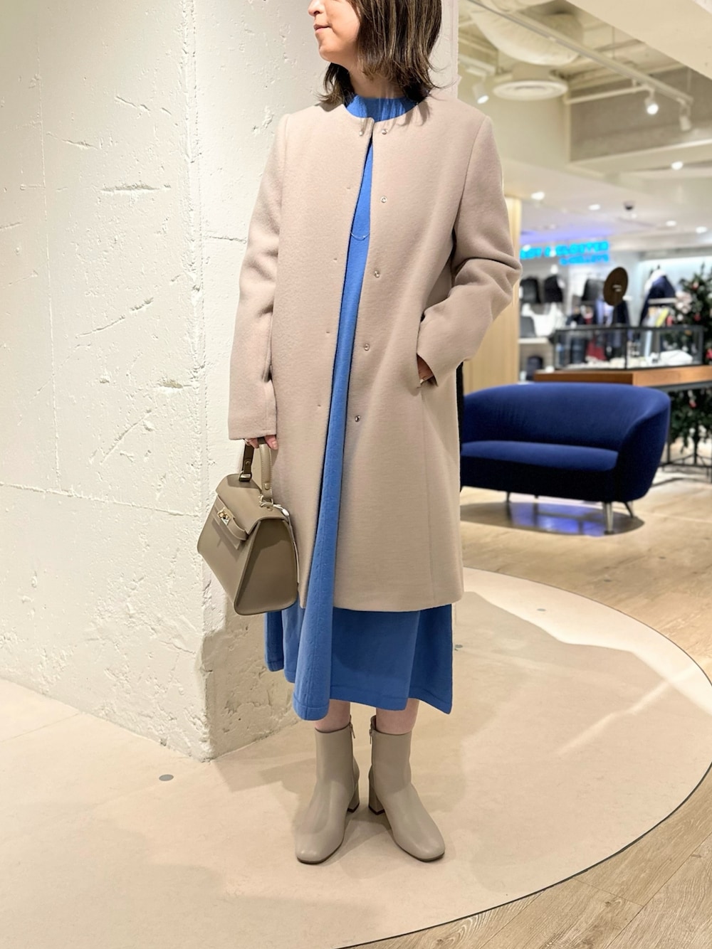 ベージュ系のワントーンに鮮やかなブルーのニットワンピースを合わせた、綺麗めお出かけコーデ! ニットワンピースはAラインのシルエットと袖口のパールボタンがポイントの、上品に着ていただけるワンピースです。