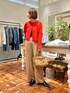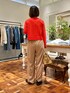 1枚で着映えする、鮮やかなオレンジのカーディガン! 短めの着丈、くるみボタン、袖口のシアーがポイントです。 ワイドパンツはウエストゴム&紐で絞れるイージー仕様。柔らかい生地で履き心地◎ きちんと感もあるのでオフィススタイルにもオススメです。