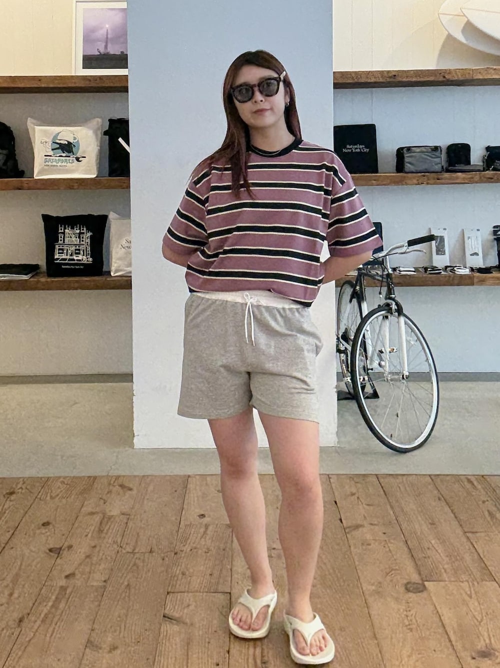 ありそうでなかったUSEDぽい配色なピンクのボーダーTeeはウィメンズのスウェットショーツと合わせて、キュートな印象に。 定番にどんなカジュアルスタイルにもハマるOOFOS。 履き心地の良さから、毎年夏になるとつい手に取って履いてしまいます。 最後に、シンプルなカジュアルスタイルにayameのグラスをプラスして少し周りと差をつけましょうƪ(˘⌣˘)ʃ