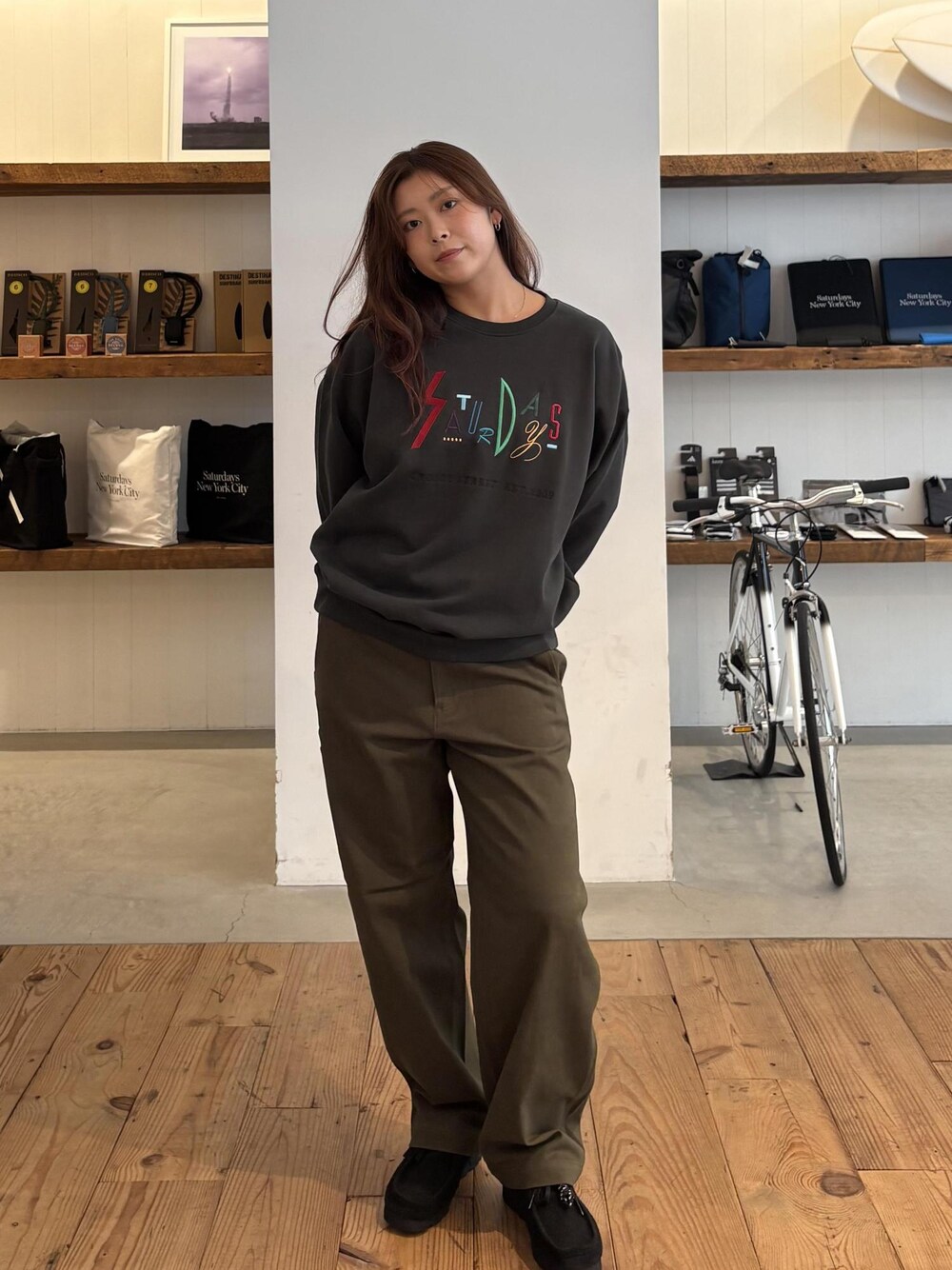 昔のアメリカ映画でみたことあるような スウェットロゴがレトロでかわいい♡ あえてサテンのスカートにヒール合わせとかも かわいいかも〜と、着回し次第で楽しめそうな、 ポップなロゴのスウェット。 涼しい季節が待ち遠しいですね〜!