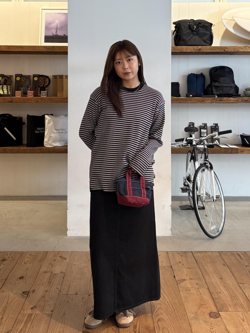 Robert P. Miller x Saturdays NYC の、ボーダーサーマル☻ 着心地はもちろん、裾と袖口が、リブではないのが ポイント!他のサーマルと差がつくところです! ロングのデニムスカートは、裾のほうに生地をたっぷりと使い、スタイルアップに見せてくれます。 長く履いて経年変化も楽しんでいただけます。