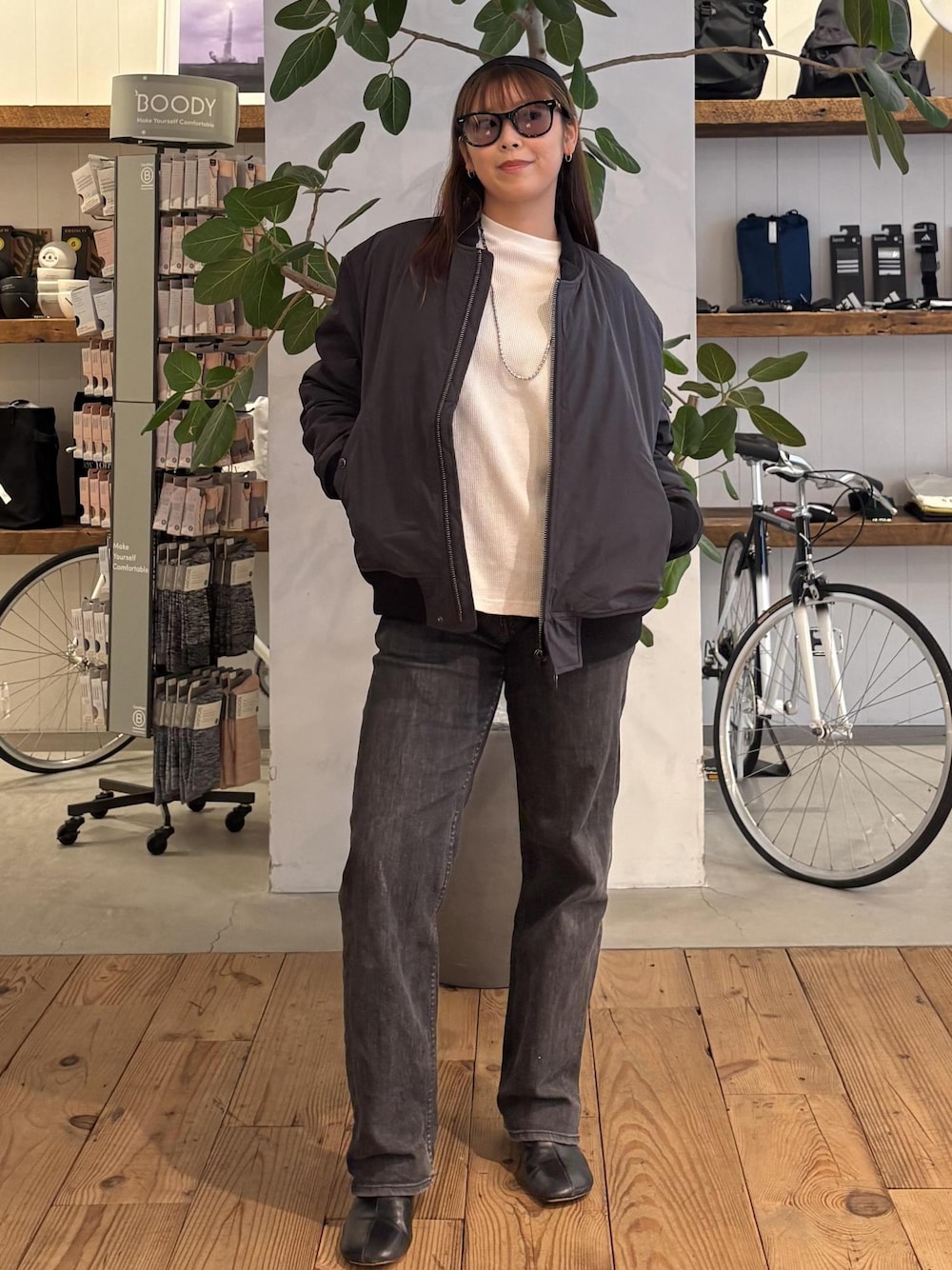 Christo BomberをMサイズで着用してみました。 個人的にはMくらいのゆるさが◎ 暖かさや機能性もありつつ、デザインがつぼ。 ピンヒールと、ヘアバンドで女性らしさを残しつつ、 コーディネートのアイテムは、メンズにふってみました。 カテゴライズされない、アンバランスな組み合わせが今の気分(╹◡╹) 他にも、 ニットのワンピースに、少しごつめのスニーカー、 さっとこちらを羽織って、、とかもかわいいですね。