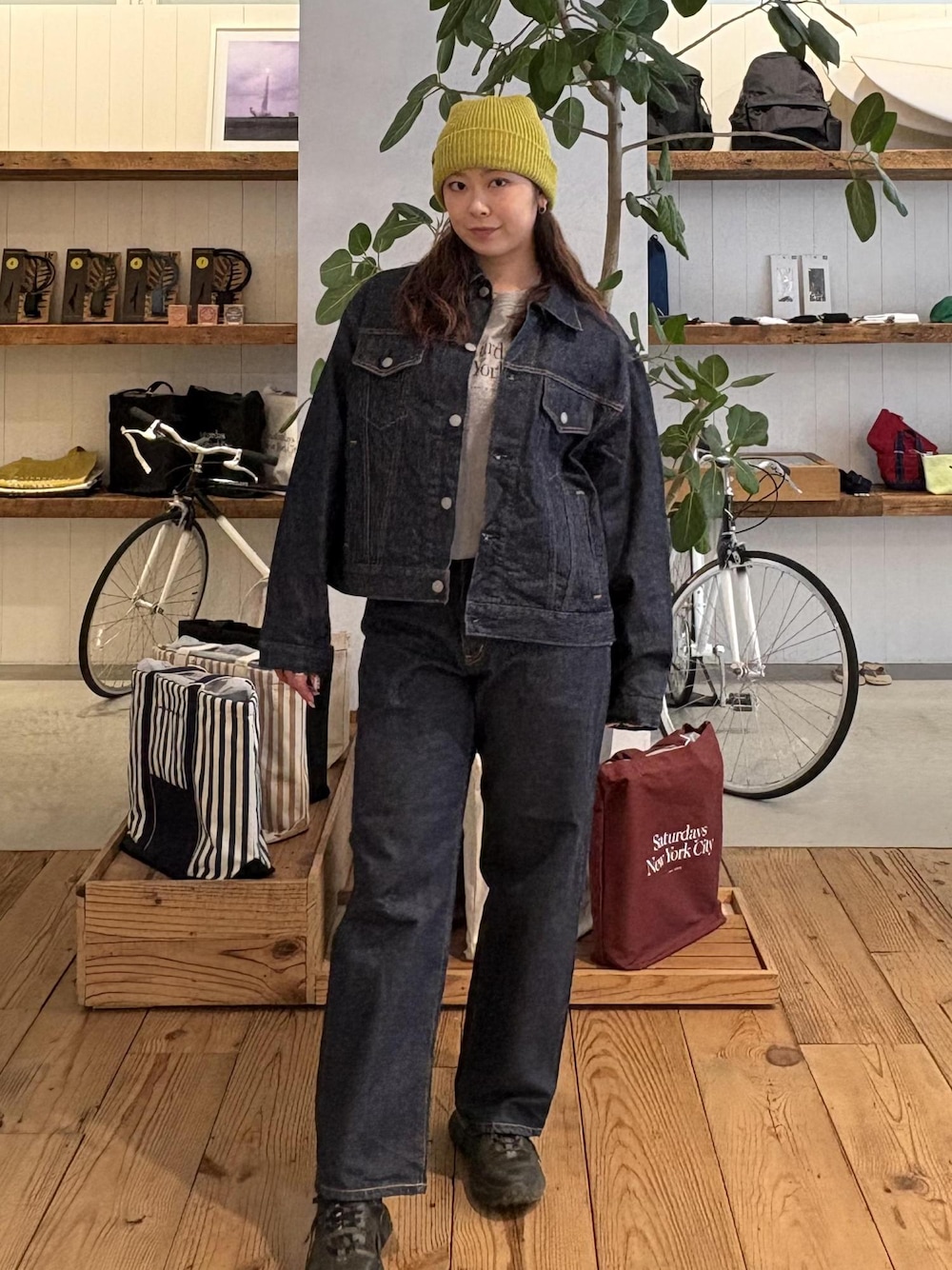 今季イチオシのデニムシリーズ! おすすめスタイリング第一弾 ワンウォッシュの濃紺デニム×差し色ビーニー サイジングも少しオーバー気味に、ビーニーに明るい色を入れて、デニムセットアップを引き立てました! この上からダウンや、コートを合わせて、デニムで春ムードを先取りしつつ、いますぐにでも着ていただけるアイテムかと思います。 寒すぎるの飽きた方! 服装から春気分取り入れて、気分上げていきましょー♩ お待ちしております。