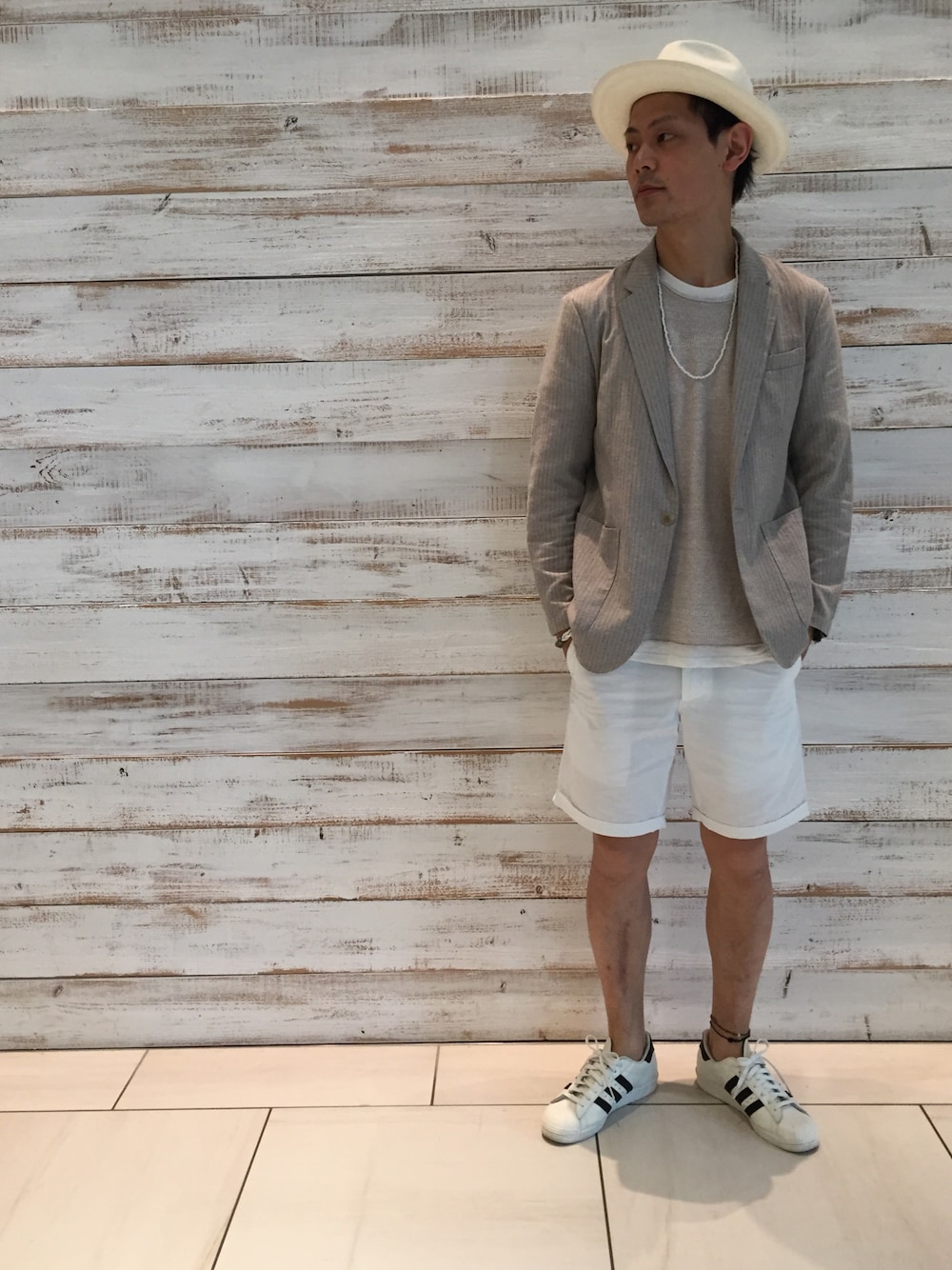 綿麻ストライプジャケットを使って大人夏コーデ。 ボトムは暑くなってきたので、やっぱりショーツがいいですね。 いつものストリートコーデとは違った感じですが、どうでしょうか(^^)?