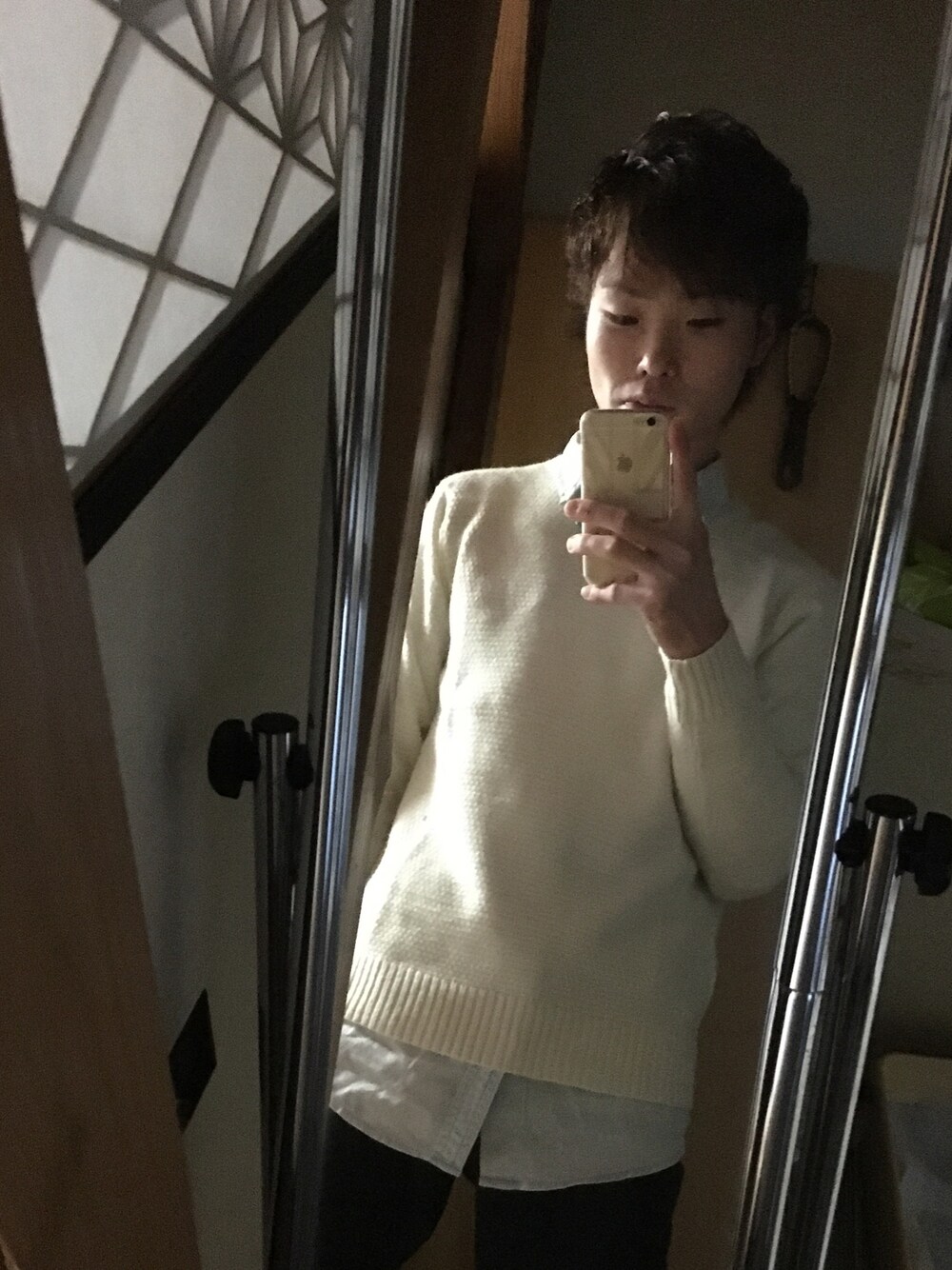 ホワイト系のニット/セーターを着用したメンズの秋コーディネートの1枚目の写真
