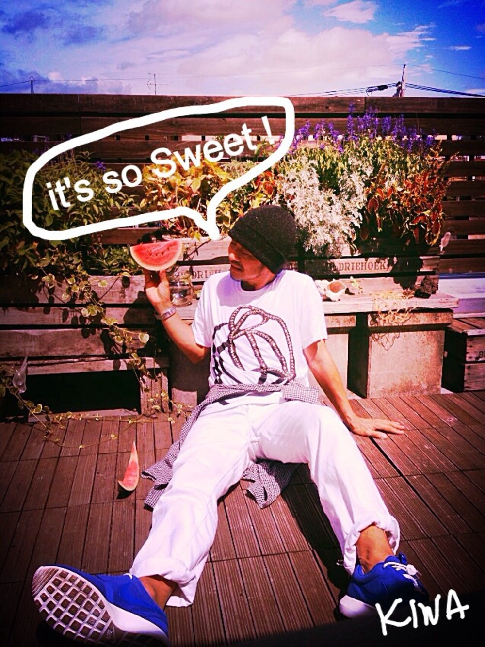 🍉🍉プランターで育てたスイカ🍉🍉 意外にも超甘かったです!! \(^o^)/ 夏を惜しみつつ、スイカの種飛ばし大会もやりました 😗➰´ 白白コーデは、ハードル高いなぁ〜(≧∇≦) スタッズ付きTシャツは友人からプレゼントで頂いた物です。