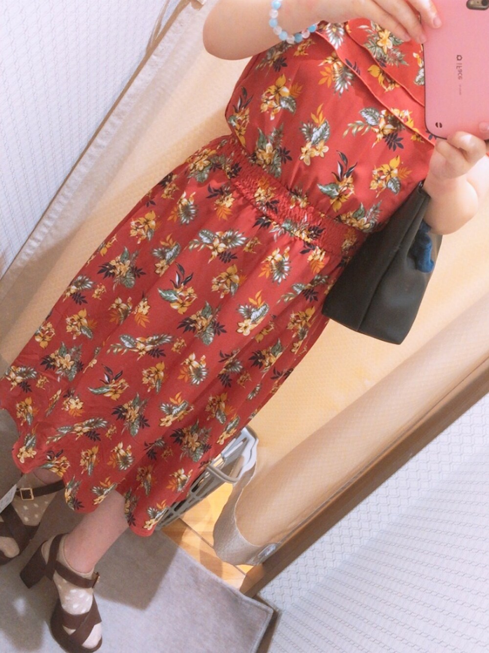 ハニーズで、大人女子コーデ花柄赤ワンピ ヒールは、茶色い物カバン黒色なぅ!