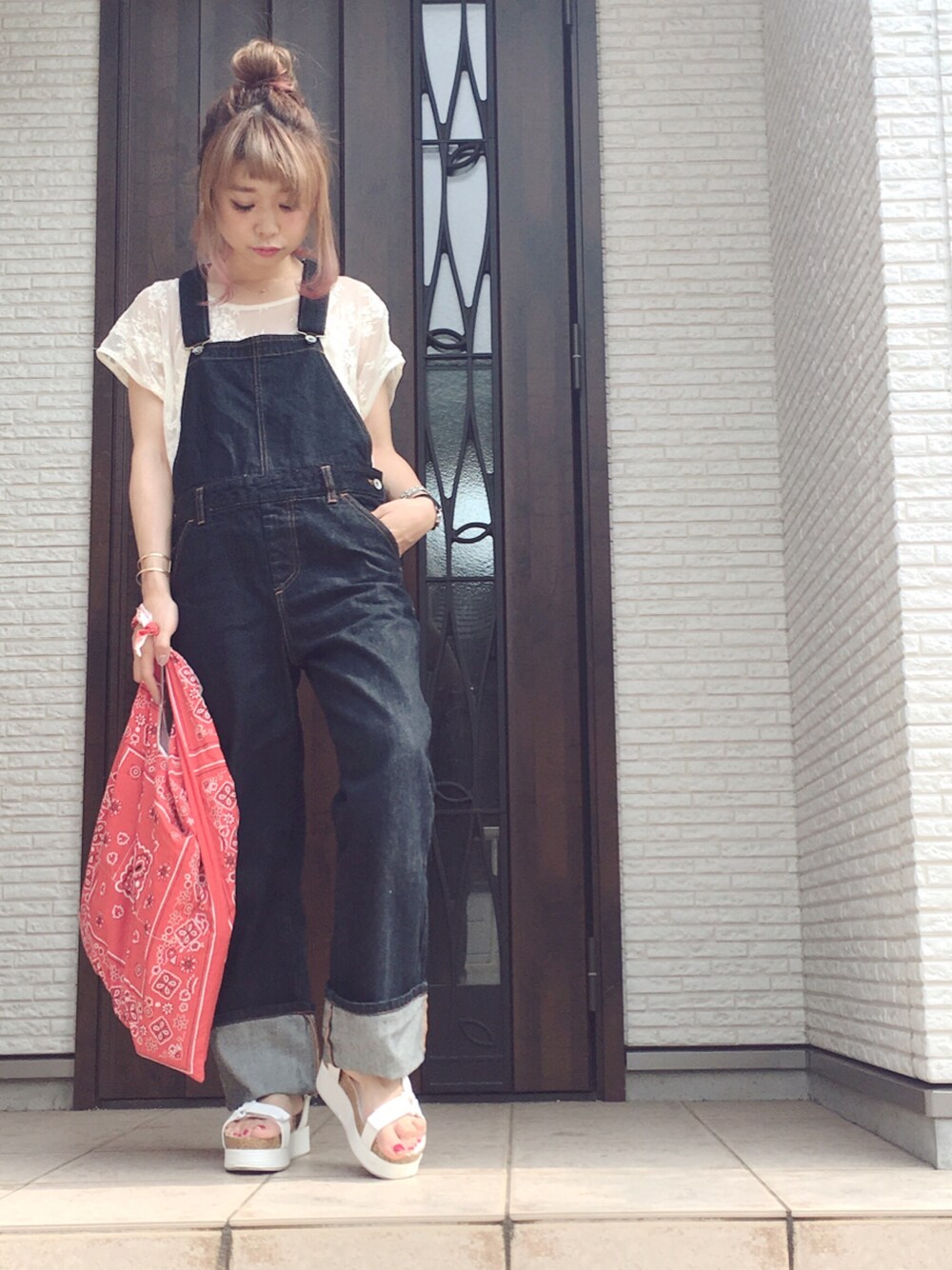 レーストップスに オーバーオール。 甘辛mix王道w バンダナ柄バッグは軽くていっぱい入るー 差し色にももってこいな代物です← 明日からまた仕事頑張るぞー。