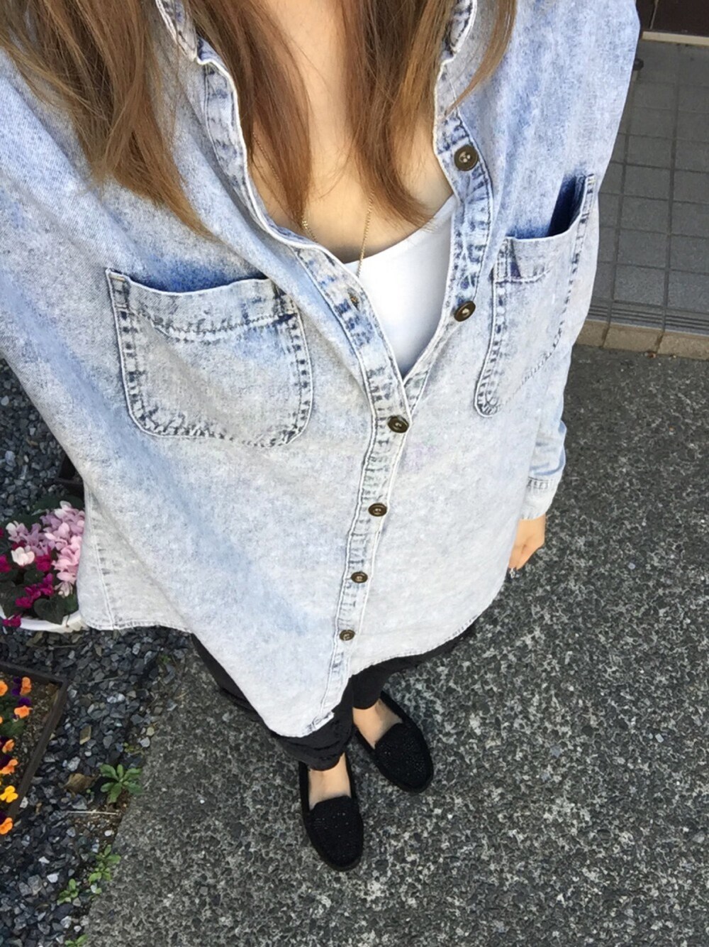 靴とシャツをどこで買ったか覚えてないです(´Д` ) パンツはダメージになっていて中からブラックのスパンコールが見えているので素肌は見えず(^o^) シャツはウォッシュ加工だけど何年も来てるからだいぶ色が薄くなっちゃってるけどオーバーサイズなのでとっても楽チン★ 子供を抱っこ紐に入れたまま授乳も出来るので重宝してます( ^ω^ )