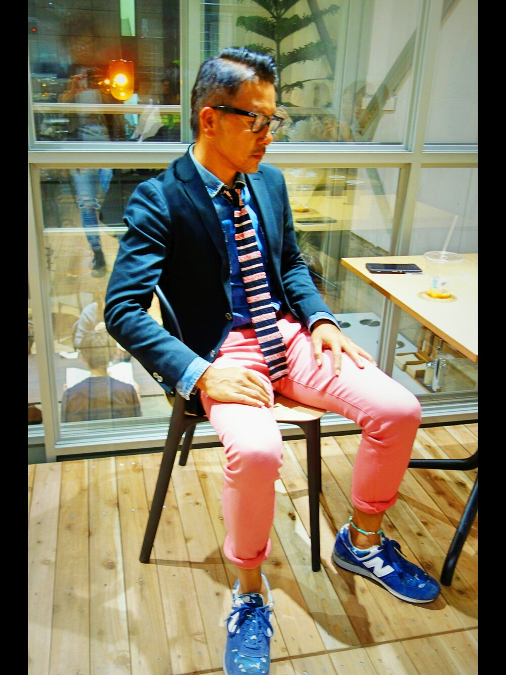 カジュアルなジャケットスタイル。 ピンクのスキニーはナノユニバースとAKMコラボモデル。 ニューバランス576ブルーカモはUS限定。