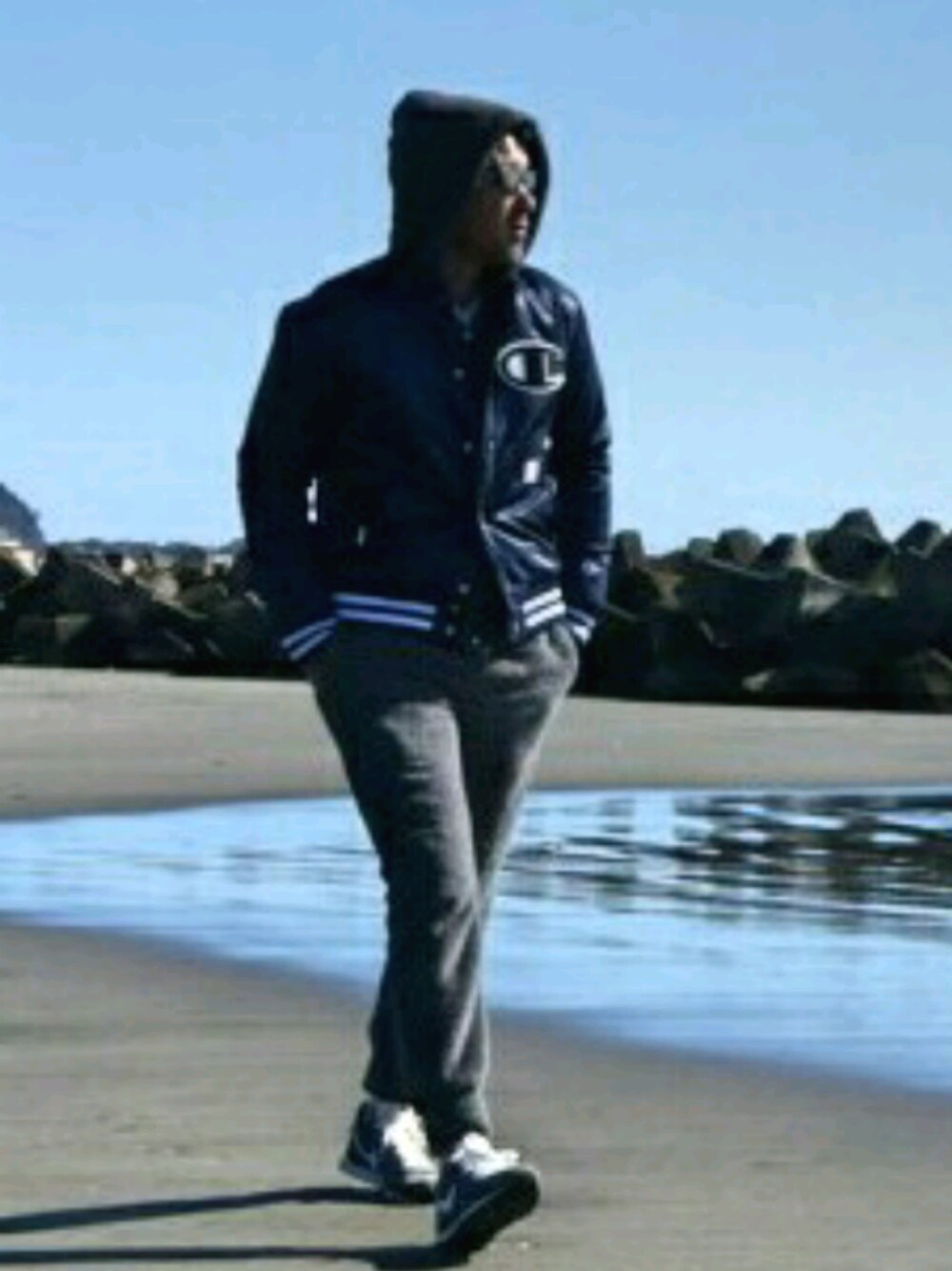 寒い日の海にはモコモコセットアップのchampionオヤジ