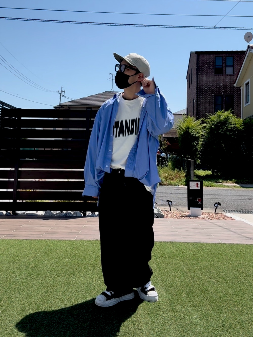 ご覧頂きありがとうございます♪ オーバーサイズで爽やかなブルーに 白で合わせてみました。 ブルーのシャツ1枚でかなり 鮮やかになりますね