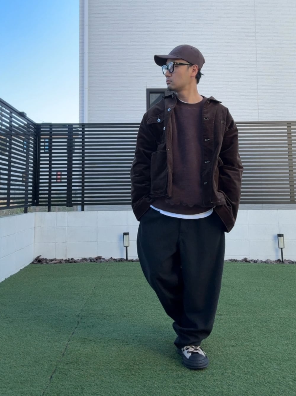 ブラウンのジャケット、インナー、キャプ ブラウンコーデ