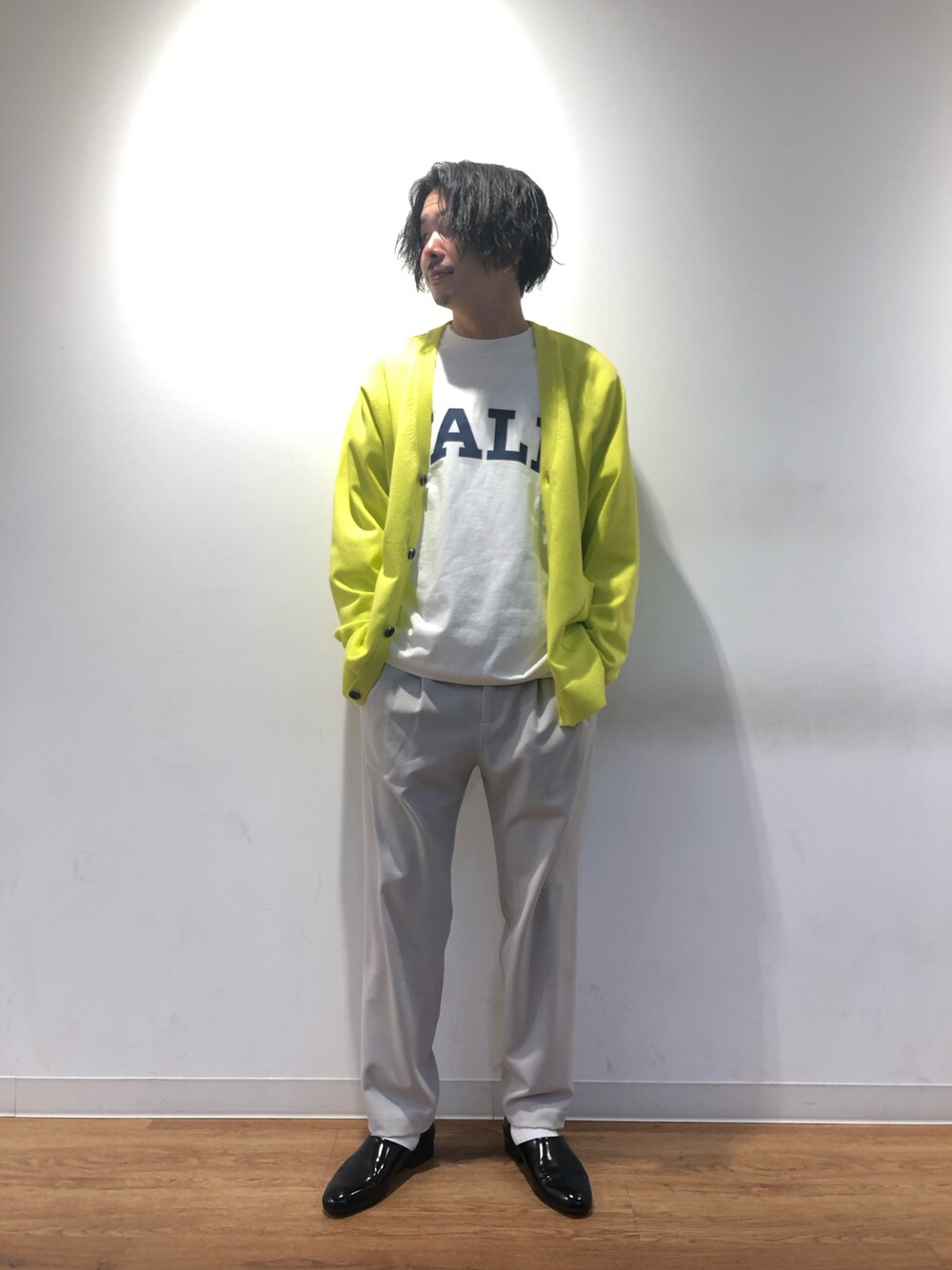今回はカレッジロゴロンTに蛍光色のカーディガンを合わせて目立たせてみました! Tシャツはカラーが他に2色ありユニセックスで着れます! カーディガンもカラー展開はありますが、色物が苦手な方などでも是非チャレンジしてもらいたいです! パンツはシワができずらいのがまたいいです!
