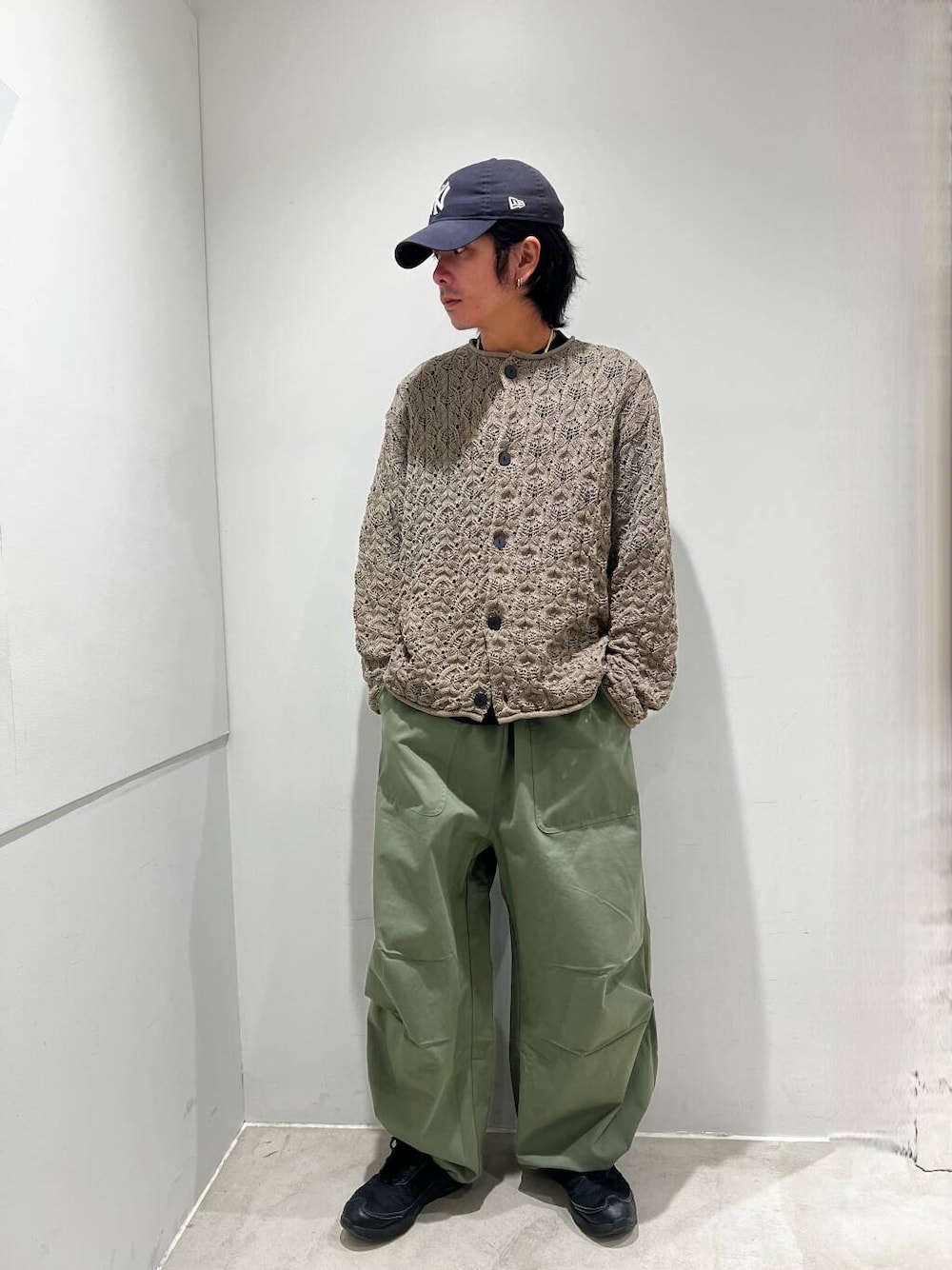 こんにちは! メッシュのカーディガンにゆったりめなパンツで合わせてみました! カーディガンはデニムと合わせてもかっこいいので是非お試しください!