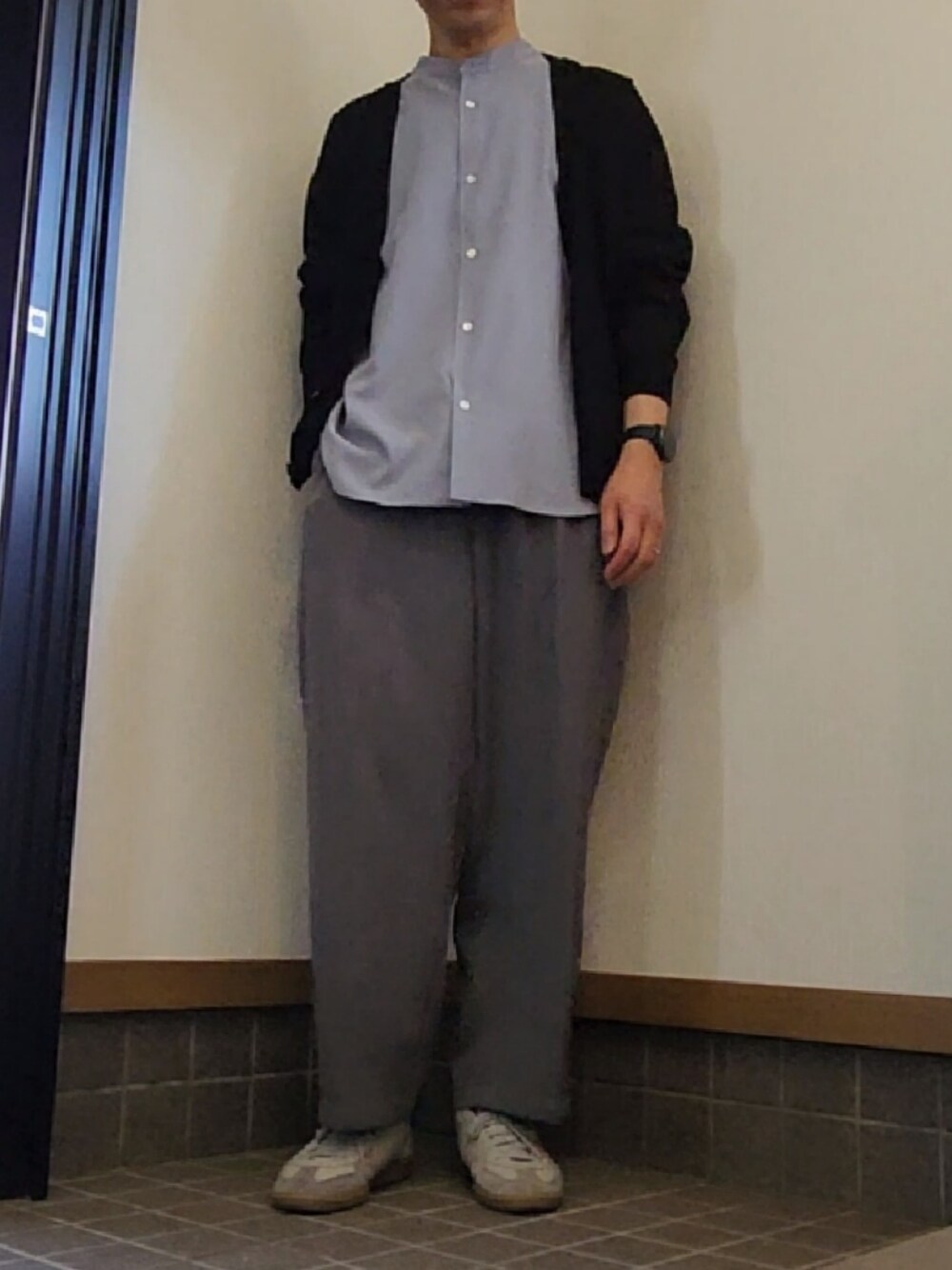 ワイドパンツにバンドカラーシャツを合わせて、きれいめのスタイルにてみました。GUのシアーカーディガンを羽織って、アクセントに。