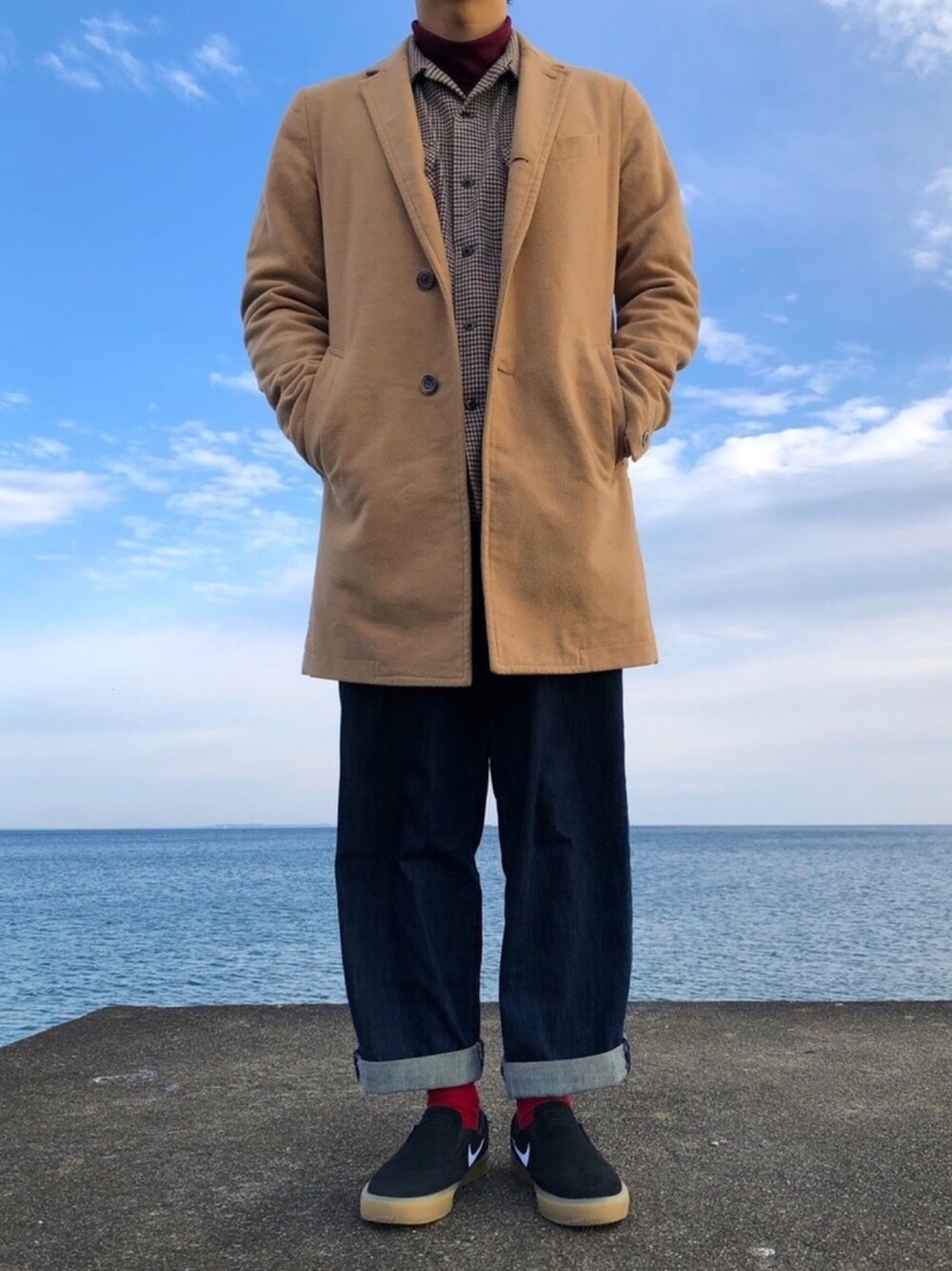 首元と足元でボルドーを入れて大人っぽくしました。 パンツは一応ワイドテーパードパンツなんですけど風が強すぎてのっぺりしてもいまたし😇 背景が映え過ぎる、、、 いいね、フォローよろしくお願いします!