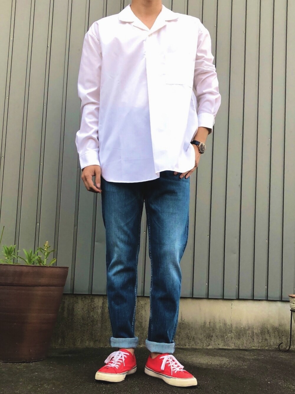 白シャツ+デニムDAY マニュアルアルファベットというブランドの プルオーバー型のシャツがとても良いです👏🏻 撮影技術により光が飛び過ぎてますが、 光沢感ある生地製で、ほんのりオーバーサイズであったりオープンカラーである点が程よい抜け感が出てよいですね~