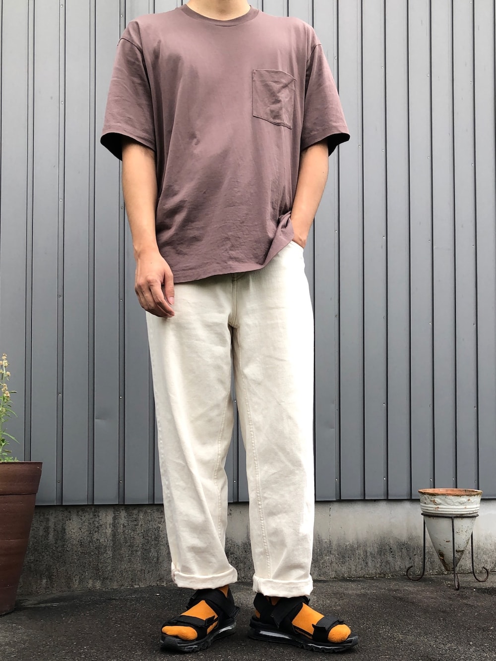 ブラウンにオレンジ差しが好きという 個人的ニュース。 Tシャツがキレイめな分、ワイドデニムや スポーティーな足元でもある程度品よく見えます
