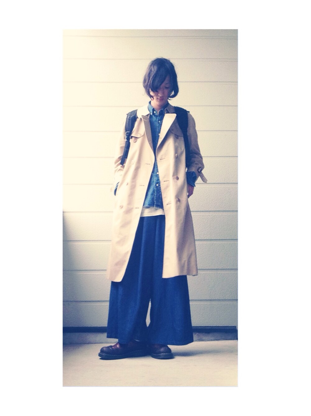 デニム×デニム デニムとベージュのトレンチは すごく相性がいい◎ インナーはパン部のシャツワンピで レイヤードとして使用。 全体的にバランス取れたコーデ
