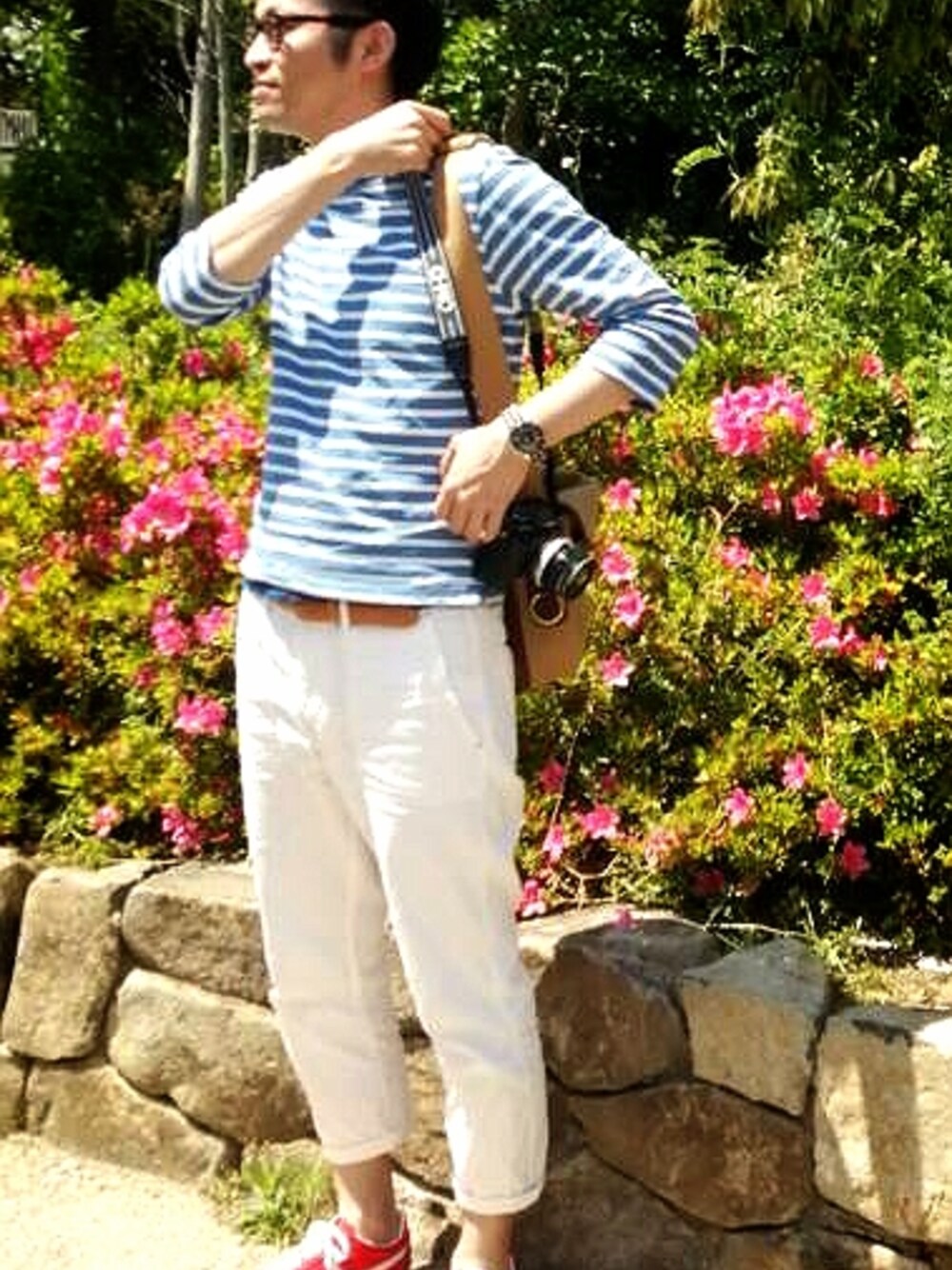 レッド系のスニーカーを着用したメンズの春コーディネートの1枚目の写真