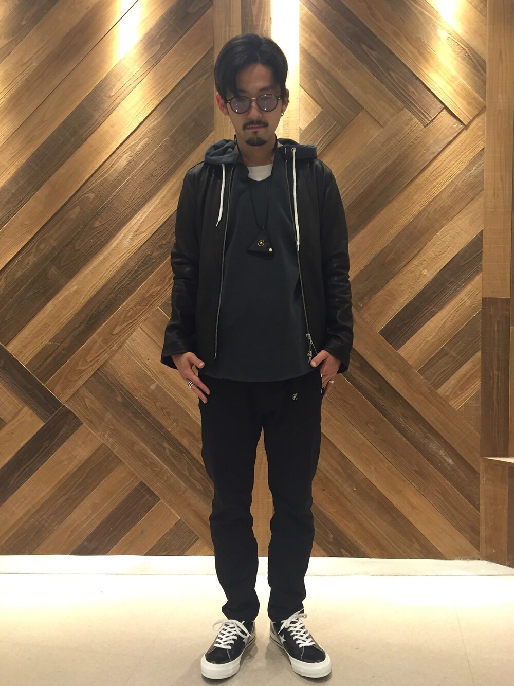 outer レザーシングルライダース (freaksstore) inner カットオフキーネックパーカー (freaksstore) pants 4w sttrack pants (グラミチ 別注) shoes converse made in japan