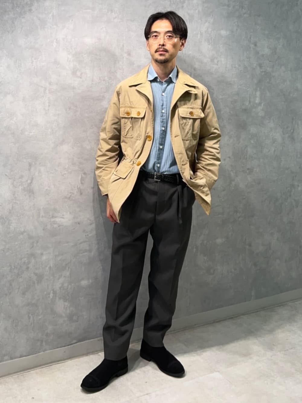 サファリジャケットはウエストを少し絞ってジャケット感覚で羽織りました。 ポケットのたくさんついたこのようなブルゾンは、一見、野暮ったくも見えますが、素材使いの妙で、さりげないモダンさを感じる一品。