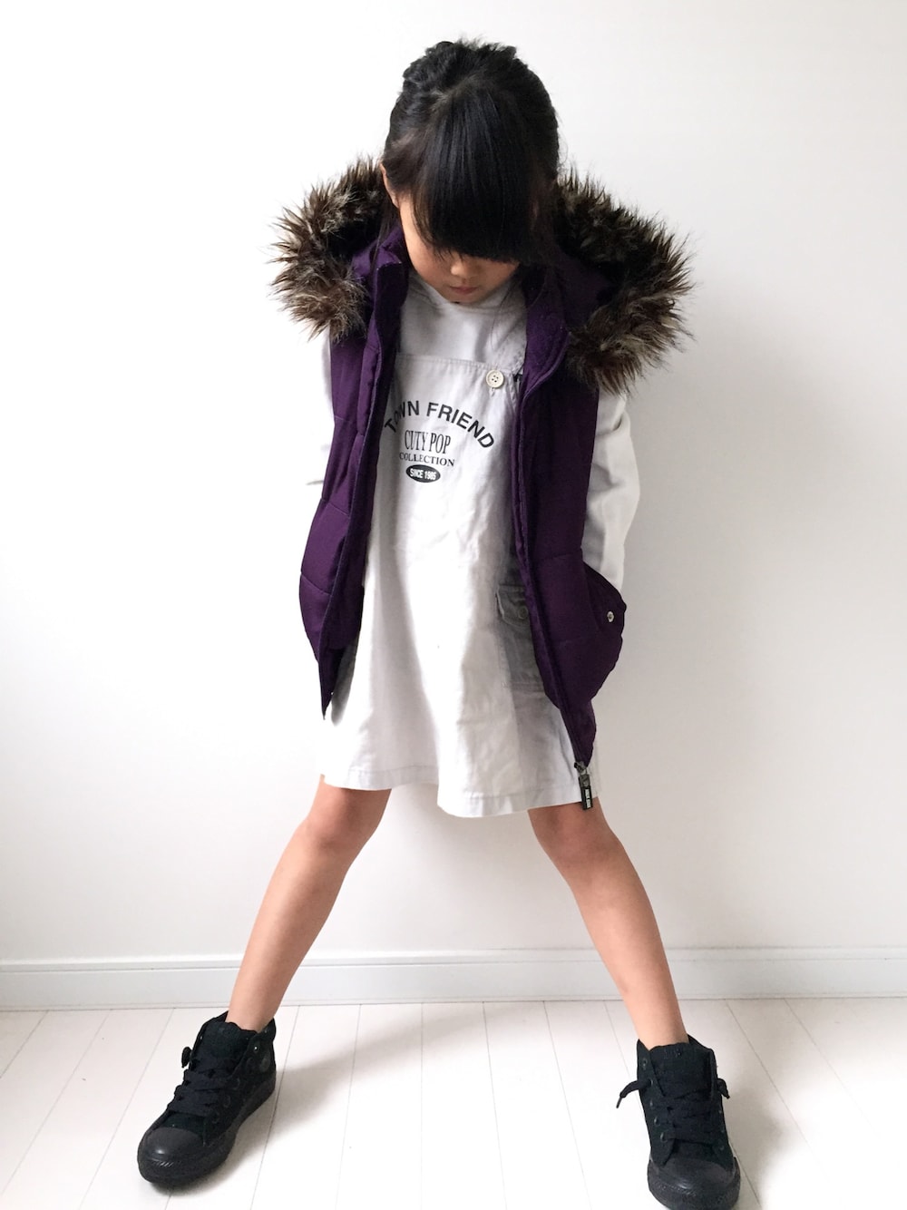ブラック系のスニーカーを着用したキッズの秋コーディネートの1枚目の写真