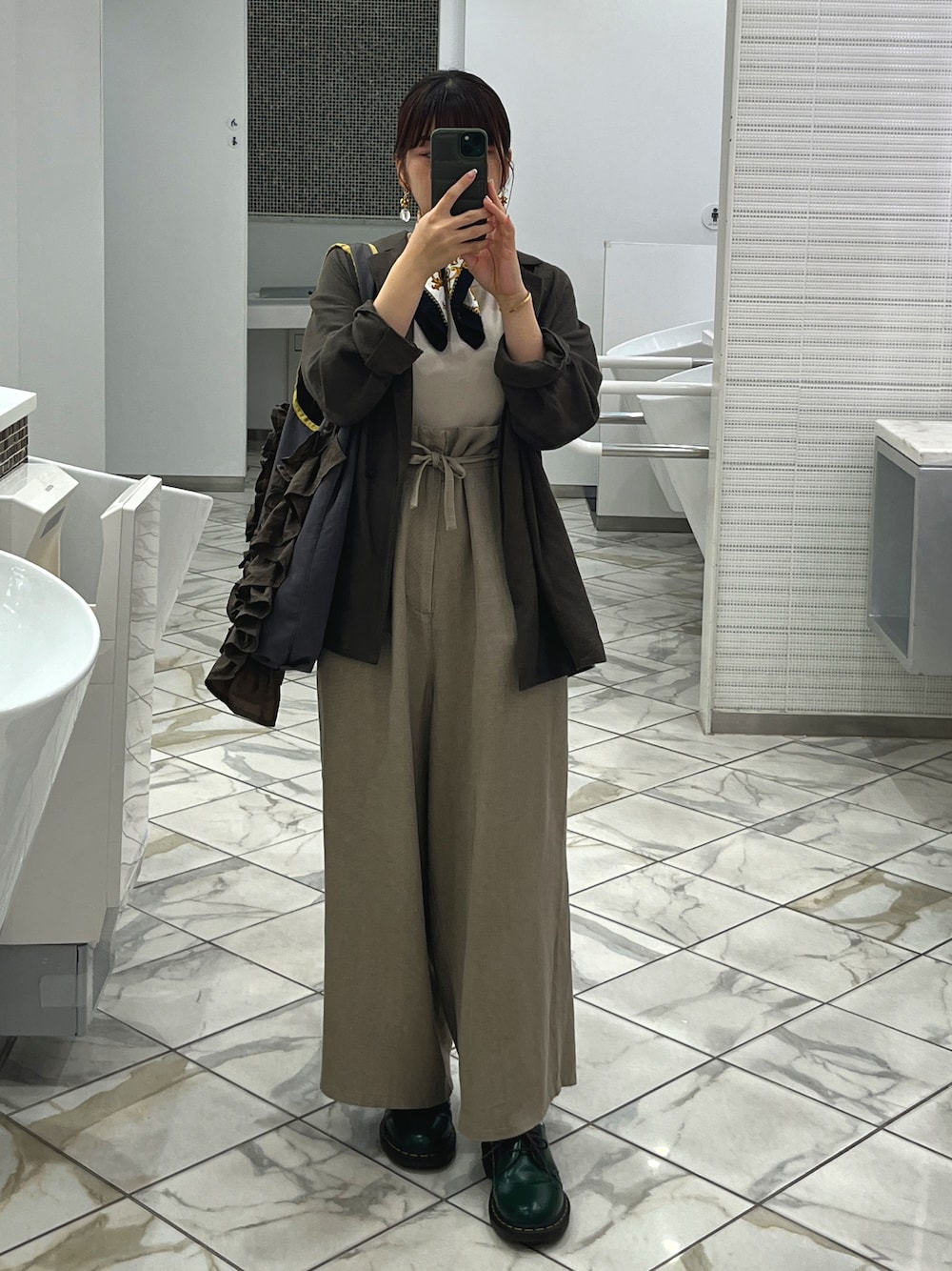 流行りのスカーフをなんとなく合わせるのではなくコーデに溶け込む形で🙌 コーデを落ち着いた色味にすることでスカーフの良さが出ます! 同系色のフリルバッグ👜で少し甘さを🤏