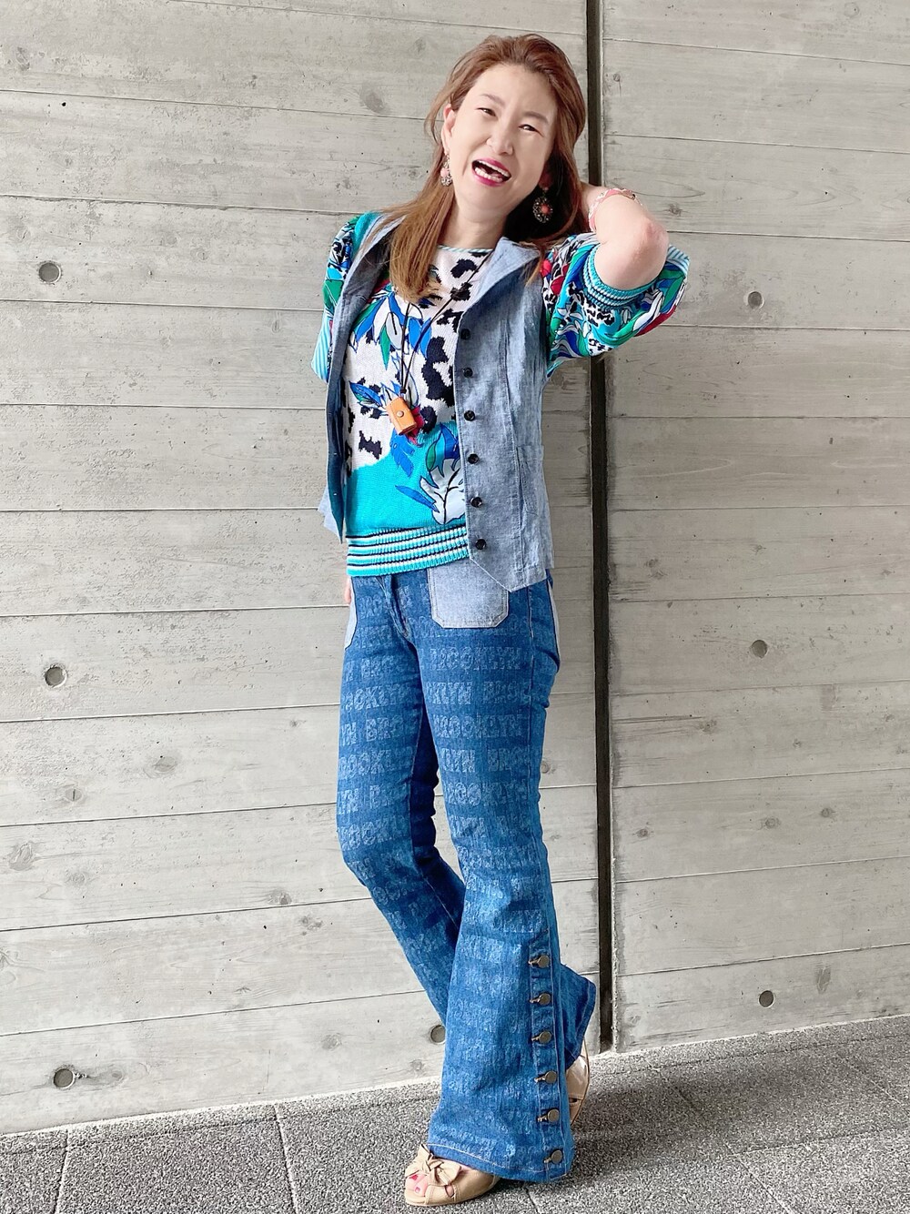 こんにちは🍀 古着コーデ♥️ ベルボトムがかっこよくベージュの サンダルを履いてます👟 ベストのインナーの生地はナイロン生地なのでとても涼しいです🙂 いつもいいねありがとう♥️