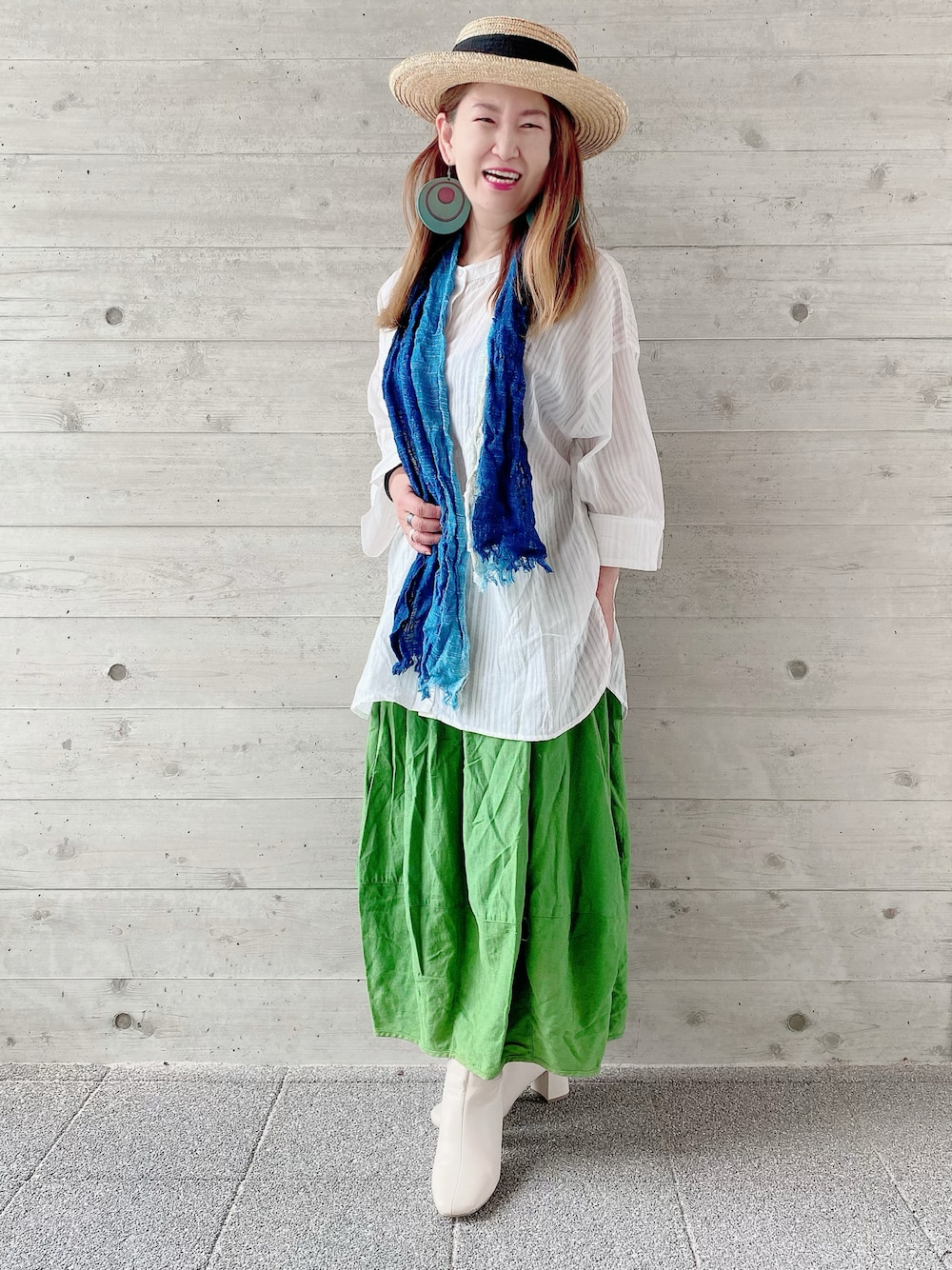 こんにちは🍀 グリーンスカートのコーデです💚 綺麗なグリーンが映えます✌️ ストールは手作りした藍染めのストール😍 ショートブーツで決めました。 ちょっと今日は涼しいですね!🌿 いつもいいねありがとう🐱