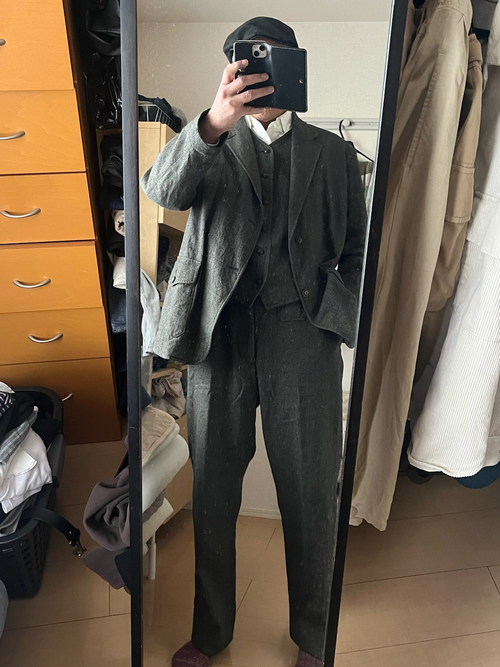ox'ed silver cobbler jacket salt&pepper 某フリマアプリにて3ピースマイサイズゲット 半額近くなら問題なかろう しかし、3ピースで着ると素晴らしい こんな格好が似合うということはすっかりジジィだなぁ